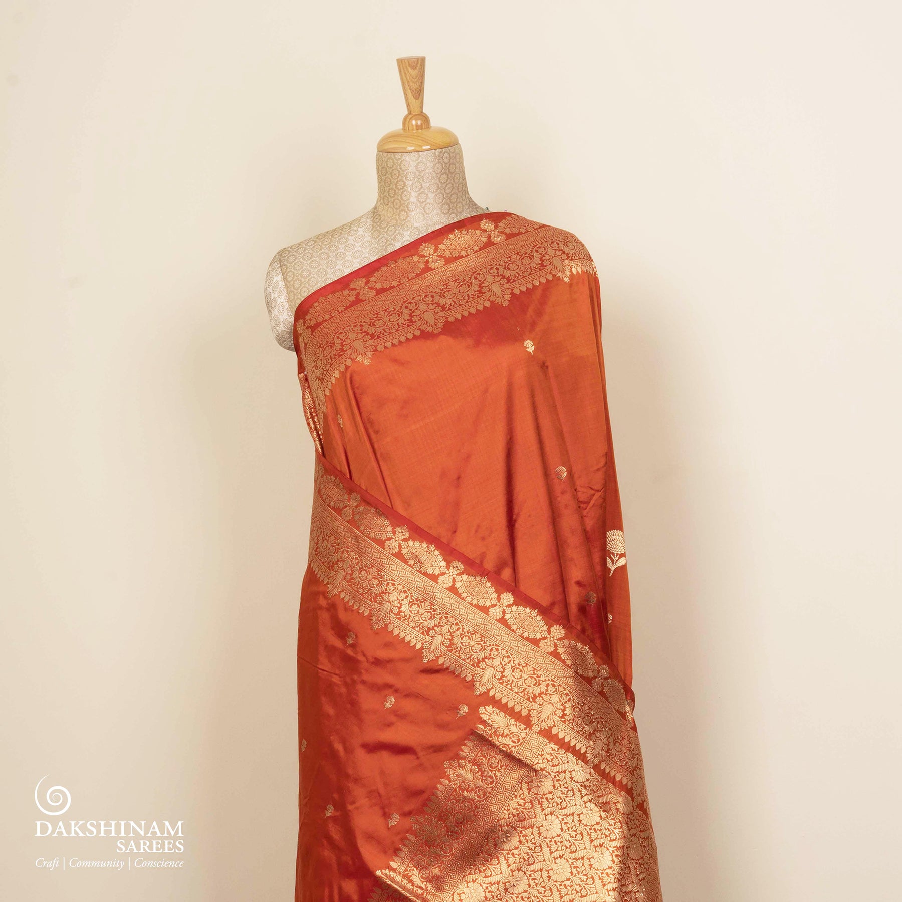 Always dry clean woven silks, especially if they feature zari or intricate weaves. Store them wrapped in muslin or cotton cloth in a cool, dark space, avoiding plastic covers. Refold every few months to prevent permanent creases, and iron gently on low heat with a protective cotton cloth placed on top.