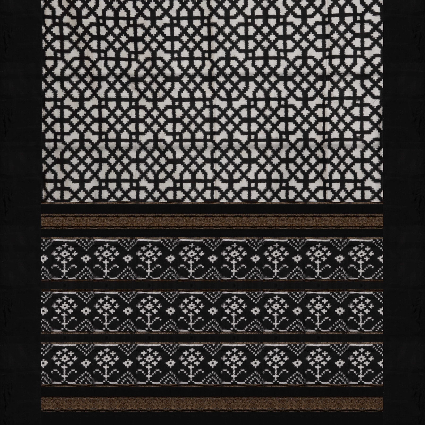This elegant double ikat silk saree features a classic black and white colour palette with a white base woven in geometric ikat patterns, showcasing fine handwoven craftsmanship. The plain black border adds a clean, structured finish, while the black pallu is enhanced with gold zari stripes and subtle floral accents for a touch of richness. Crafted in pure silk, this saree offers a graceful drape and breathable comfort, making it ideal for office wear, pooja ceremonies, and festive occasions. A plain black blouse completes the look with understated sophistication.