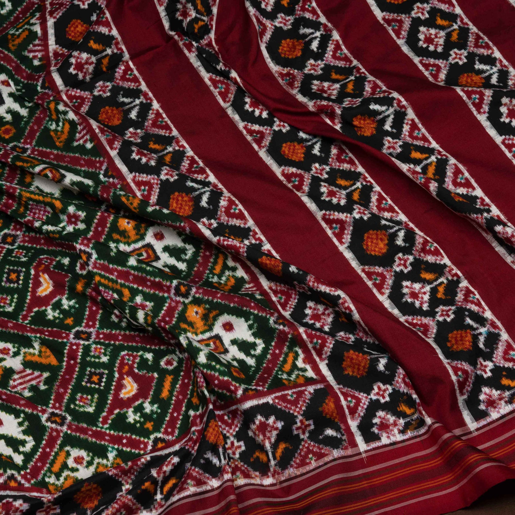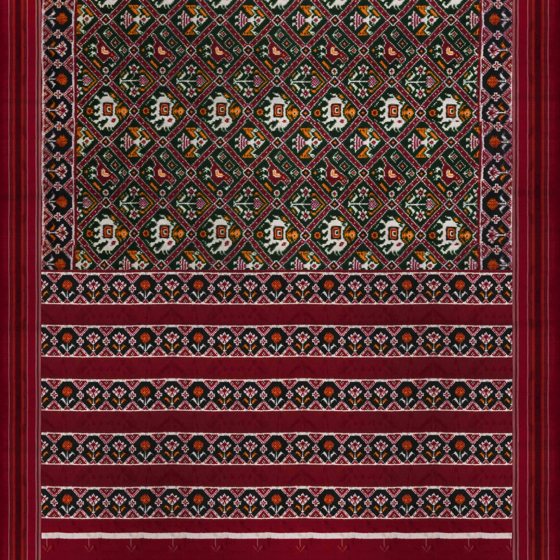 A celebration of meticulous craftsmanship, this exquisite double ikat silk saree showcases a vibrant multicolour body woven with intricate diamond patterns. Traditional motifs of birds, elephants, graceful women, and florals come alive through the complex double ikat weaving technique, where both warp and weft are resist-dyed before weaving—resulting in exceptional precision and depth.
