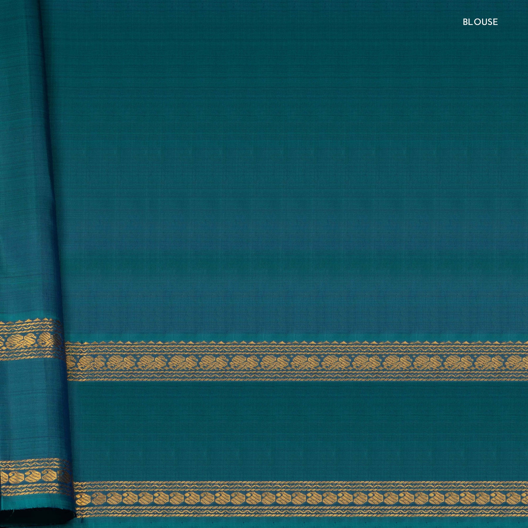 Crafted using pure mulberry silk and traditional gold zari, this saree beautifully balances richness with sophistication. Ideal for temple visits, weddings, festive celebrations, and family occasions, it embodies the cultural legacy of Kanchipuram weaving. The coordinating teal blouse with a zari border completes the saree harmoniously.