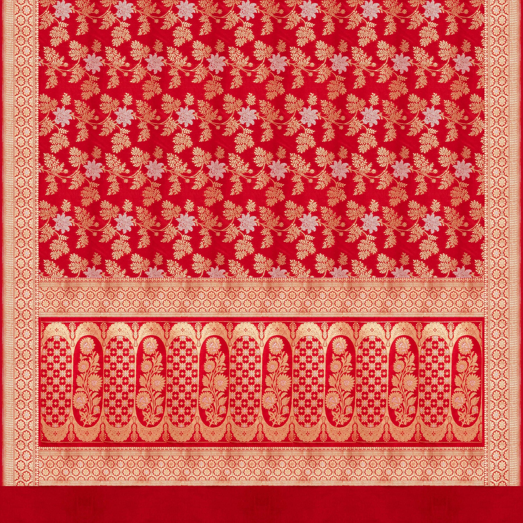 Celebrate timeless bridal elegance with this rich red Banarasi silk saree, beautifully adorned with an all-over floral and leaf jaal woven in shimmering gold and silver zari. The monotone border features intricate geometric jaal with delicate floral buttas, adding refined depth to the design. Completing the look, the grand pallu showcases elongated paisley and floral panels highlighted in gold and silver zari, lending a classic Banarasi grandeur. Ideal for weddings, bridal trousseaus, and festive occasions, this saree reflects the richness of traditional handloom artistry.