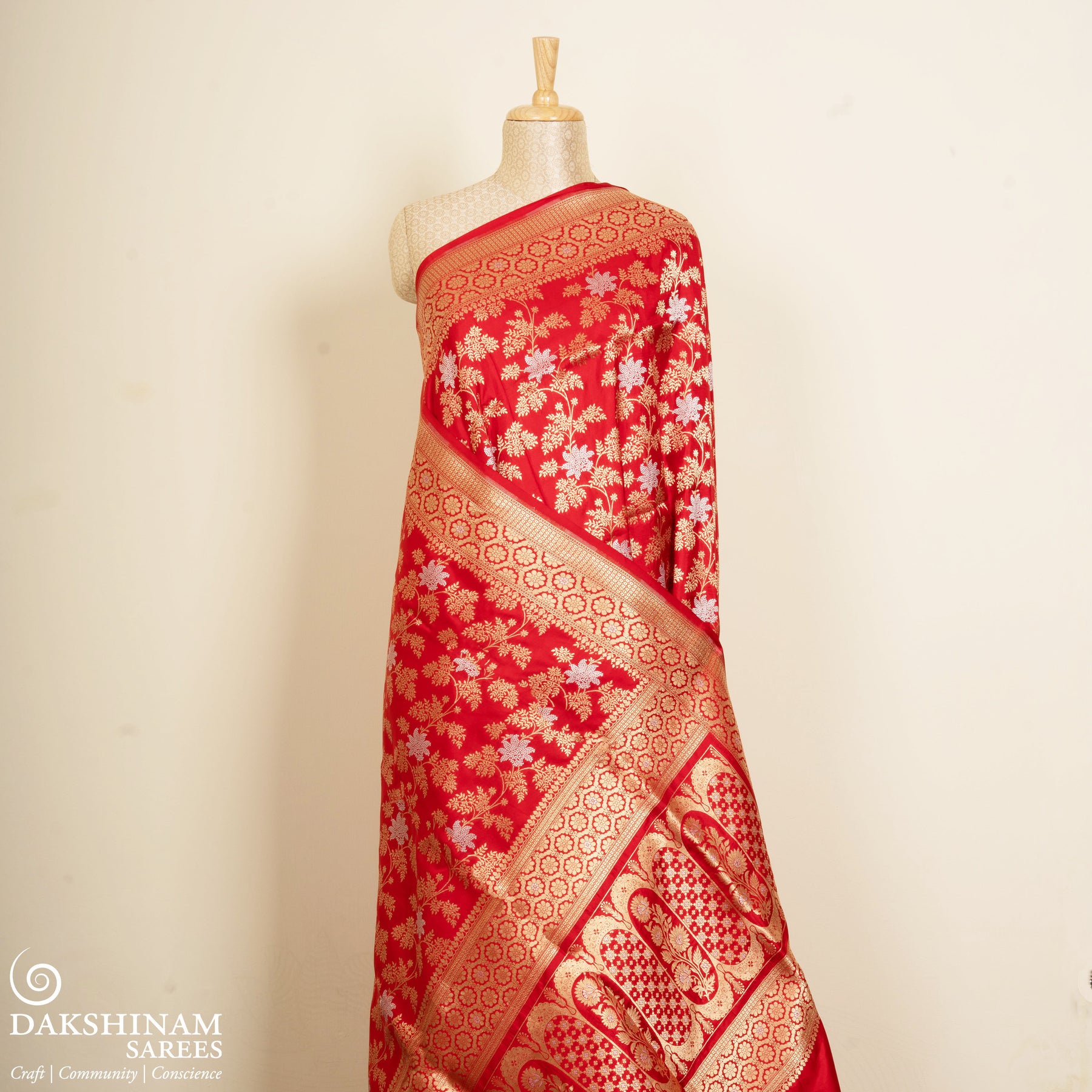 Always dry clean woven silks, especially if they feature zari or intricate weaves. Store them wrapped in muslin or cotton cloth in a cool, dark space, avoiding plastic covers. Refold every few months to prevent permanent creases, and iron gently on low heat with a protective cotton cloth placed on top.