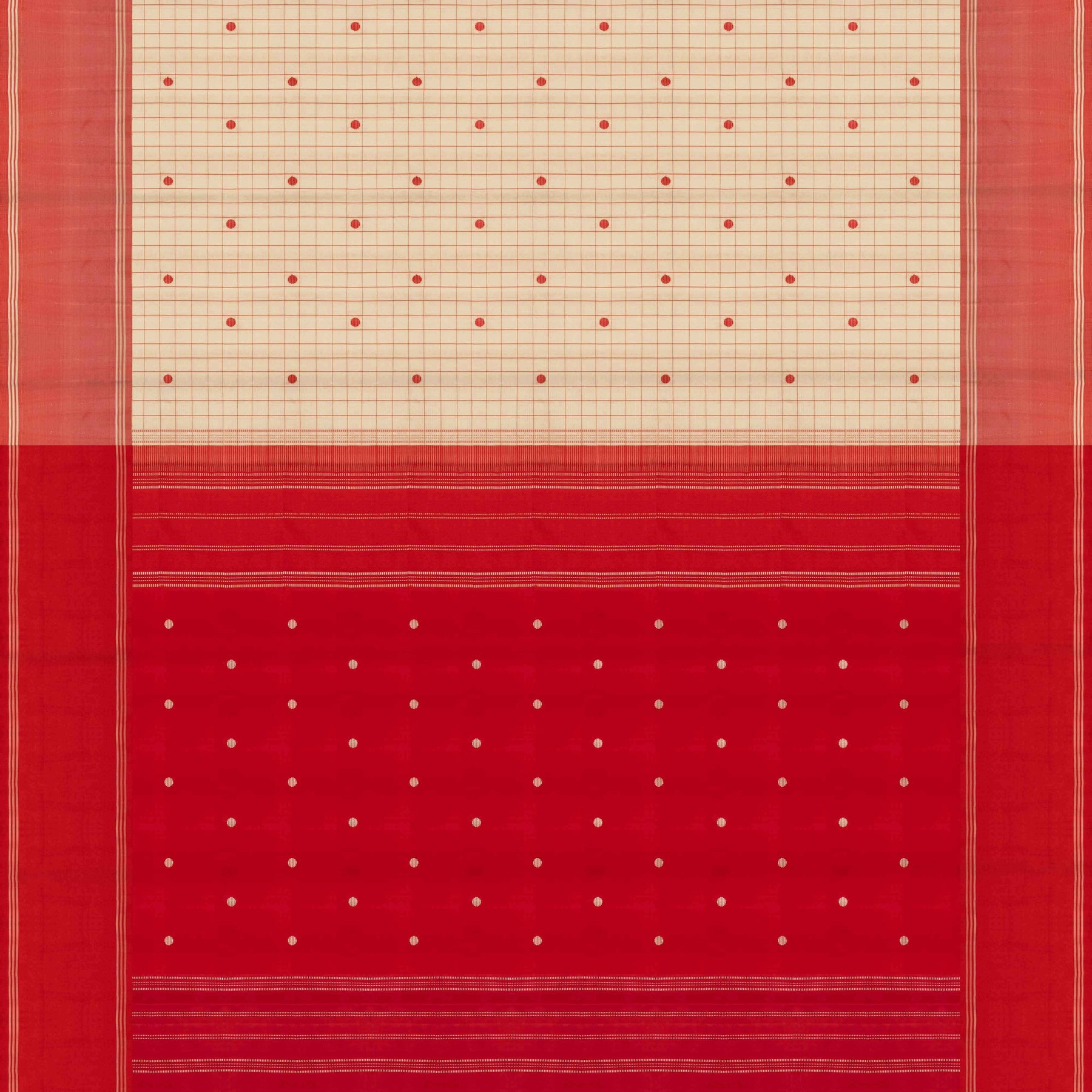Embrace timeless elegance with this refined double Kanjivaram silk saree in a serene offwhite shade, crafted in classic Pattupettu style without zari for a clean and graceful appeal. The body features subtle checks accented with delicate dot detailing, lending quiet texture and traditional charm. A striking dual-tone border in red and offwhite with fine stripes adds contrast while maintaining simplicity. The red pallu is beautifully designed with offwhite dots and striped accents, completing the saree with understated sophistication. Woven in pure Kanjivaram silk with zero zari, this saree is lightweight, breathable, and ideal for festive gatherings, temple visits, and elegant everyday wear. The red blouse with a matching border enhances the overall harmony of the ensemble.