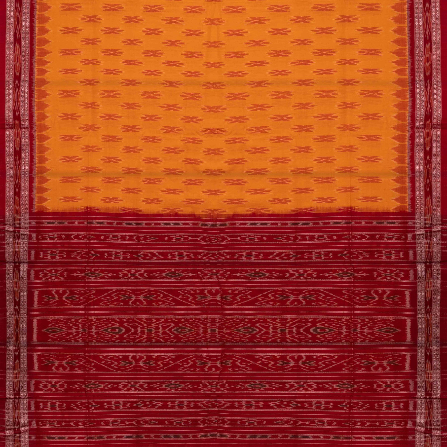 This vibrant handwoven Ikat cotton saree showcases a radiant light orange body, adorned with intricate star-shaped motifs. Triangular patterns gracefully frame the body as they lead into a deep maroon border rich with traditional floral designs. The pallu mirrors the elegance of the border with its combination of floral motifs, diamond shapes, and rhythmic stripes, all beautifully rendered in maroon. Woven without zari, this lightweight and breathable cotton saree reflects the soul of artisanal Ikat weaving. An ideal pick for everyday elegance or cultural occasions, this piece is both timeless and comfortable.