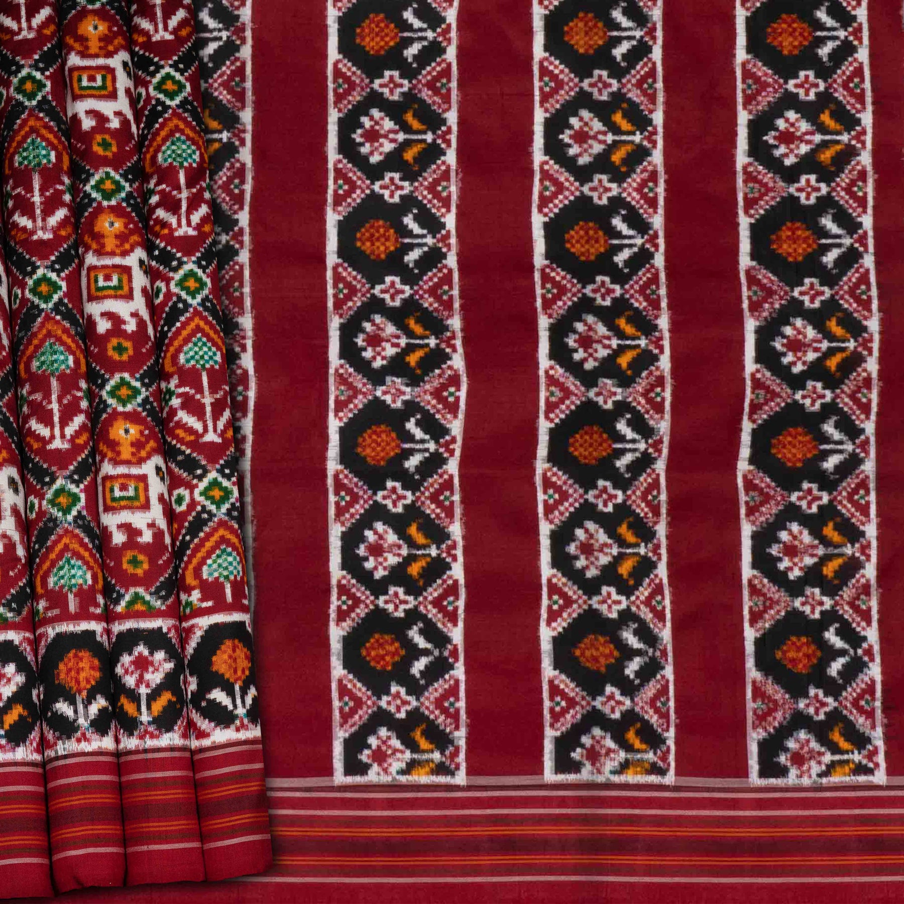 Celebrate timeless artistry with this exquisite Rajkot Patola double Ikat saree, featuring a vibrant multicolor body adorned with intricate diamond-shaped patterns and motifs of elephants, peacocks, floral plants, and traditional women figures. The rich maroon border highlights elegant stripes and floral plant motifs, while the maroon pallu showcases beautiful bands of floral designs arranged within hexagonal patterns, woven with both gold and silver zari to elevate the saree’s grandeur. Crafted using the rare and complex double Ikat technique, this pure silk saree offers a soft, breathable drape ideal for poojas, festive occasions, and formal events. The matching maroon blouse with striped detailing completes this regal ensemble.