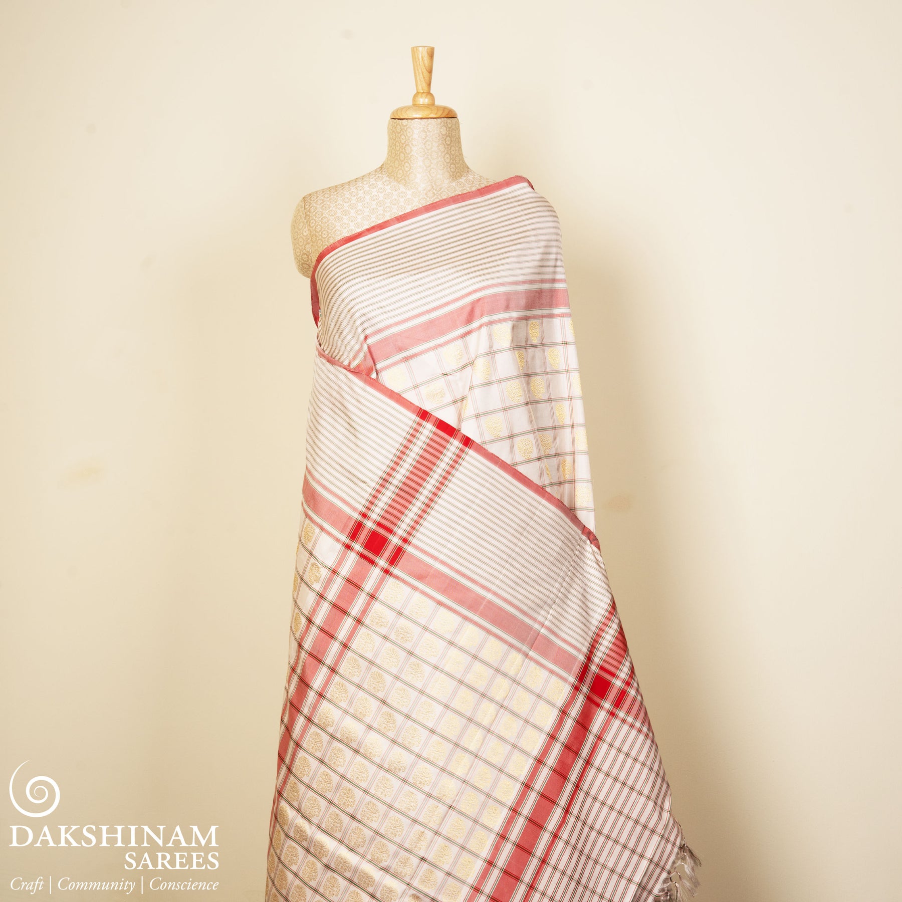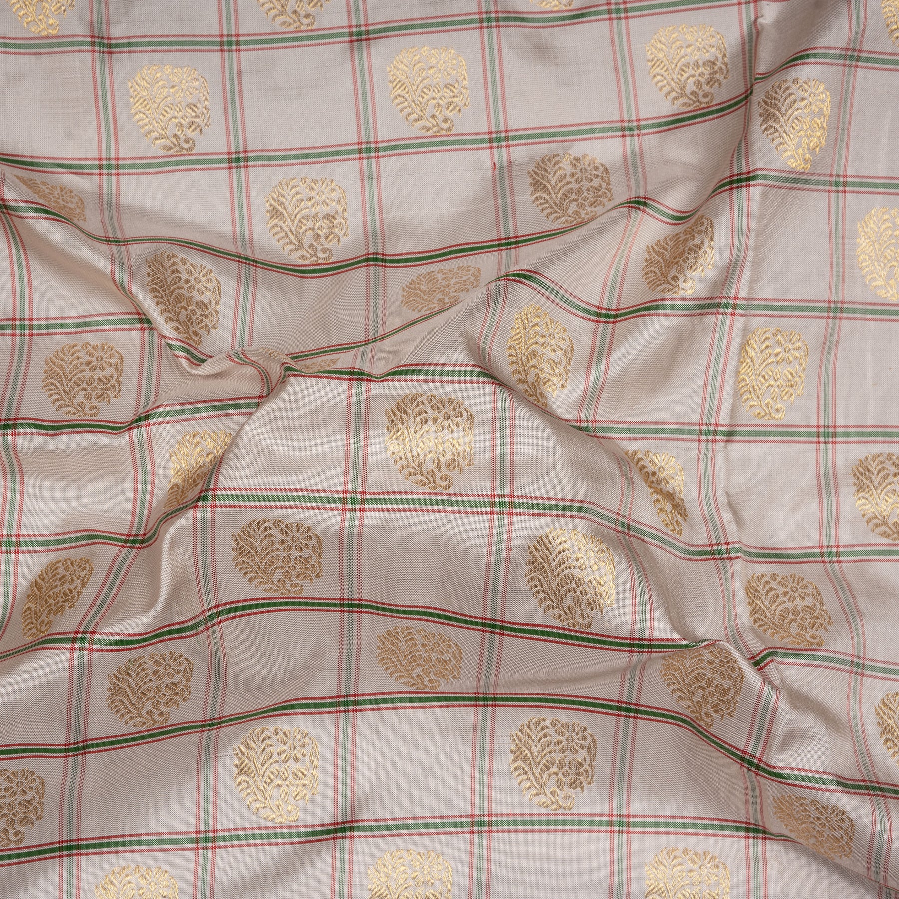Always dry clean woven silks, especially if they feature zari or intricate weaves. Store them wrapped in muslin or cotton cloth in a cool, dark space, avoiding plastic covers. Refold every few months to prevent permanent creases, and iron gently on low heat with a protective cotton cloth placed on top.