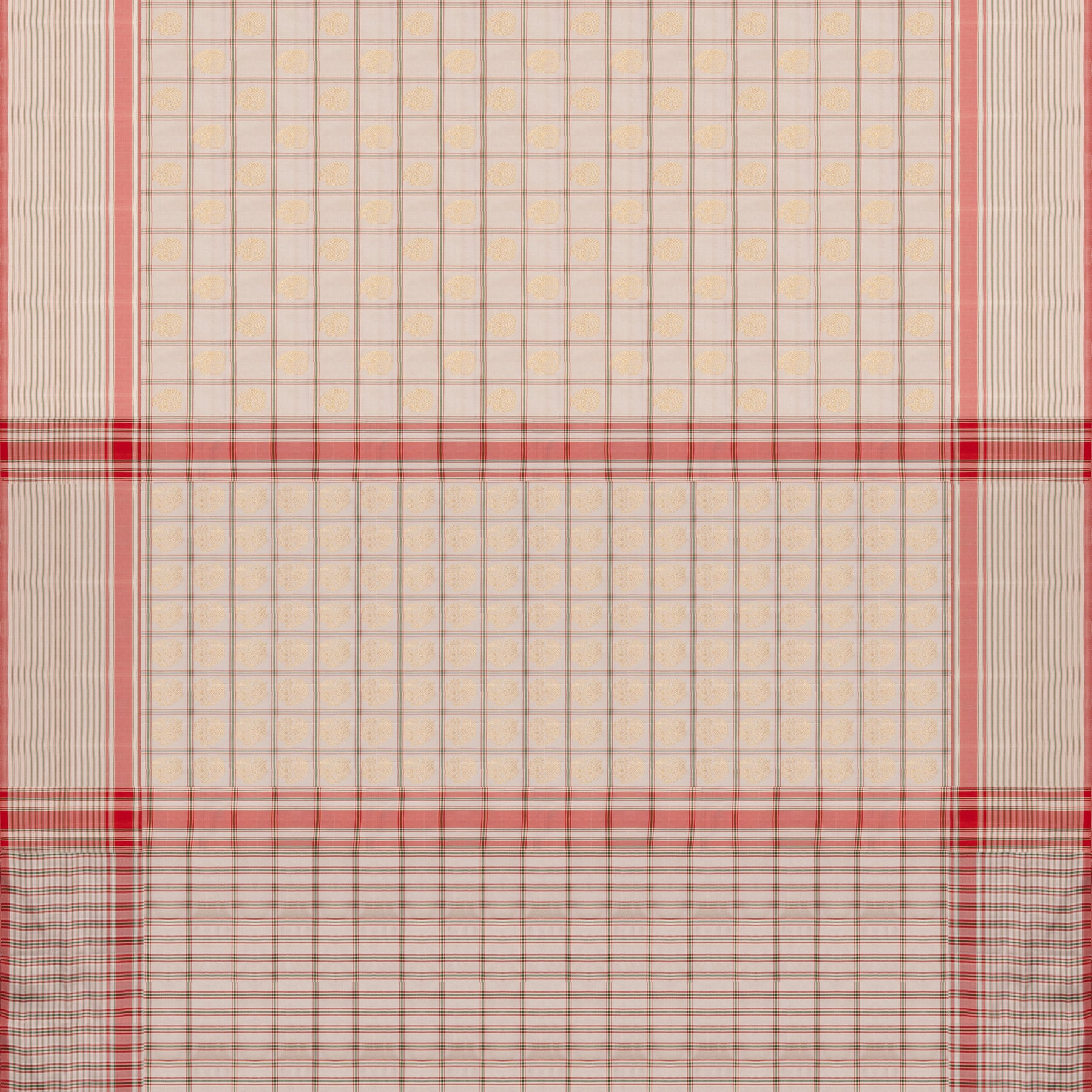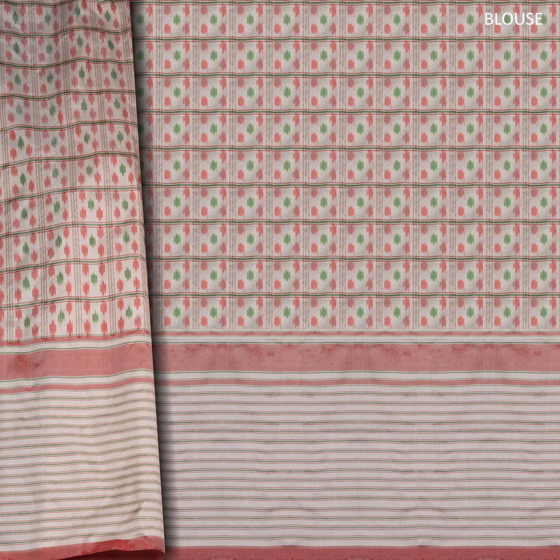 This elegant handwoven Pochampally ikat silk saree features a graceful off white body highlighted with classic ikat check patterns and traditional kadiyal buttas, showcasing the beauty of intricate weaving. The subtle off white border is enhanced with fine horizontal lines, a contrasting red panel, and rectangular check patterns that add a refined traditional touch. Paired with a matching off white blouse designed with vibrant green and red Pochampally ikat patterns, this saree beautifully reflects heritage craftsmanship and timeless elegance, making it perfect for festive occasions, cultural events, and traditional wear.