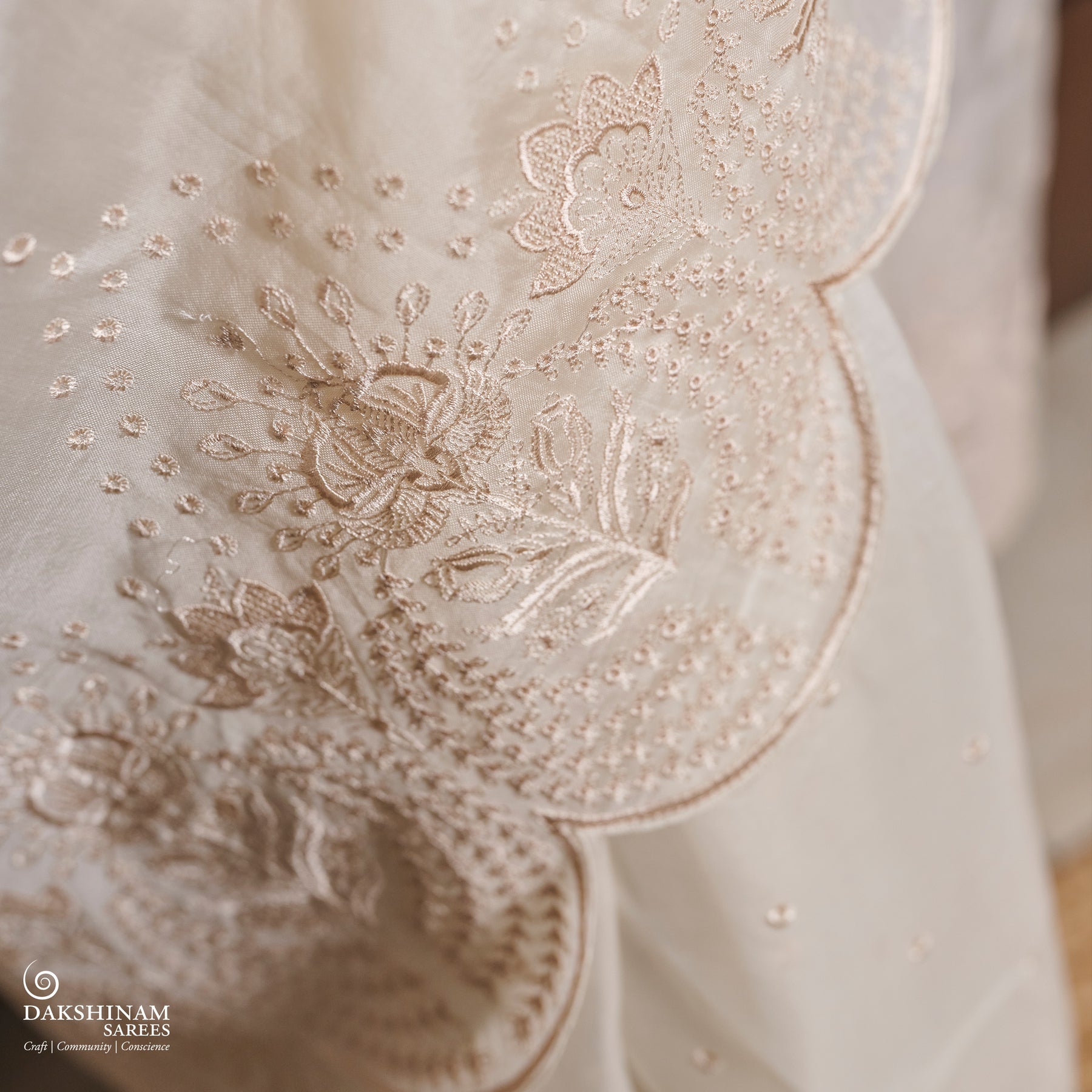 Gracefully elegant, this offwhite Organza silk saree showcases delicate dotted embroidery across the body, lending it a soft and refined charm. The monotone border and pallu are beautifully finished with intricately embroidered leaf vines and floral plant motifs, highlighted by a scalloped hem that adds a touch of sophistication. Crafted in lightweight Organza silk with fine machine embroidery, this saree is perfect for festive gatherings, daytime celebrations, and elegant occasions where subtle detailing makes a statement.