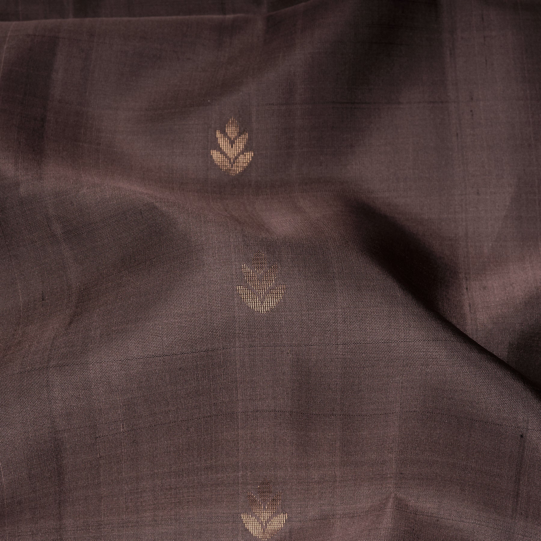 Grace your wardrobe with this elegant soft silk saree featuring a refined grey body adorned with delicate leaf buttas woven in rich gold zari. The contrasting purple border adds depth with beautifully detailed floral vines, geometric rectangles, and triangular motifs, while the purple pallu continues the same intricate design for a harmonious finish. Lightweight and fluid in drape, this soft silk saree is ideal for long festive hours, intimate celebrations, and elegant everyday wear, blending comfort with understated luxury. The contrast purple blouse perfectly completes the ensemble.