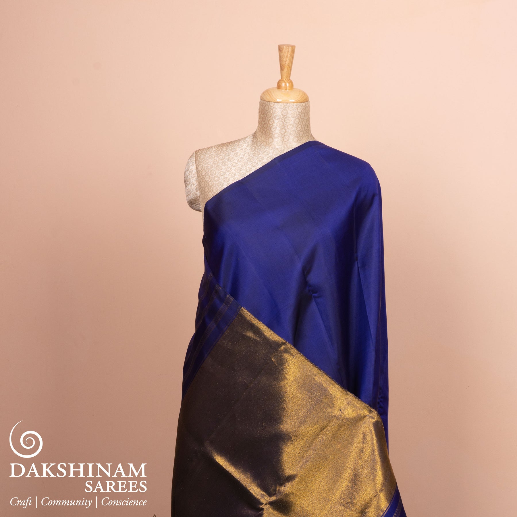 Pleats/body of Handwoven Navy blue temple Kanjivaram silk Saree
