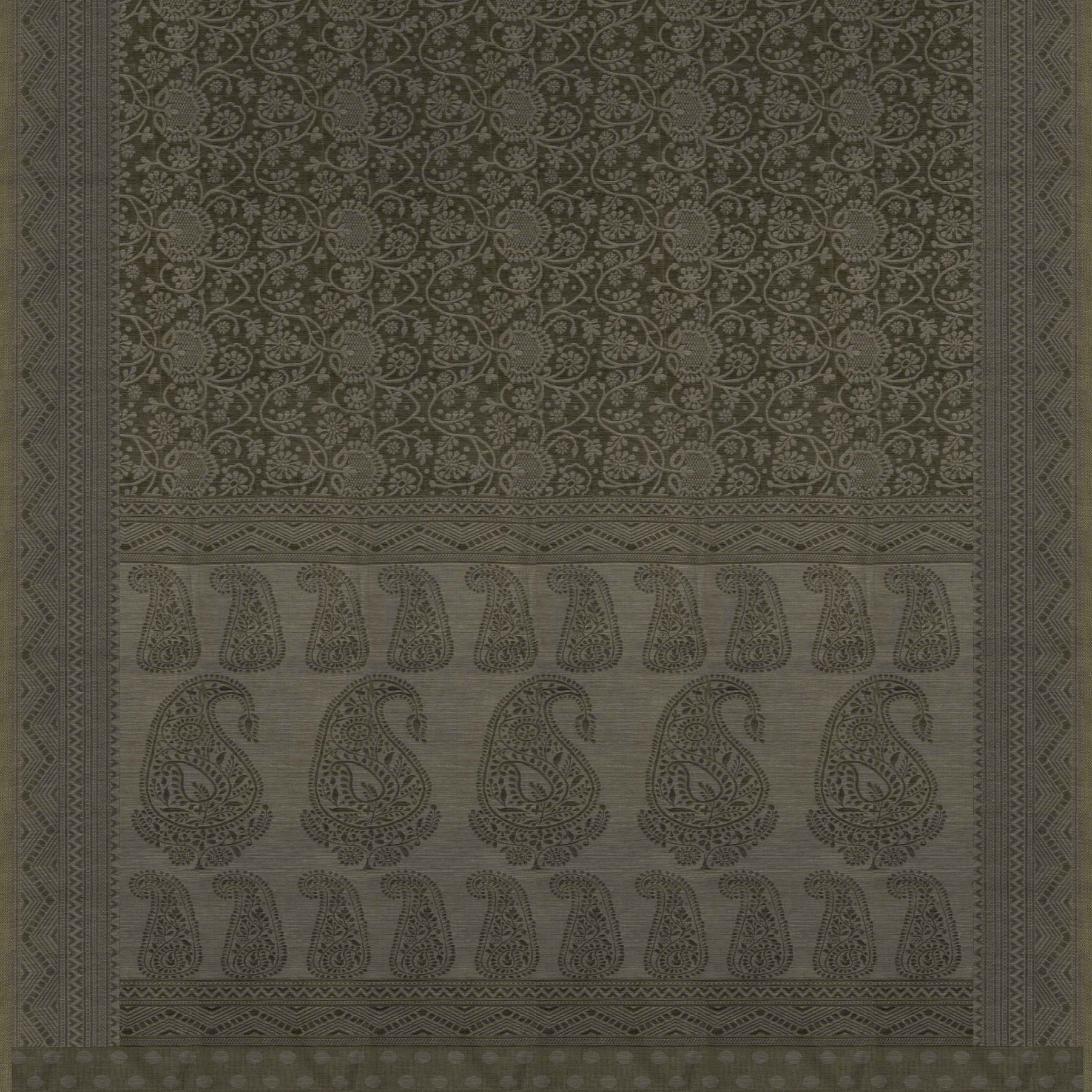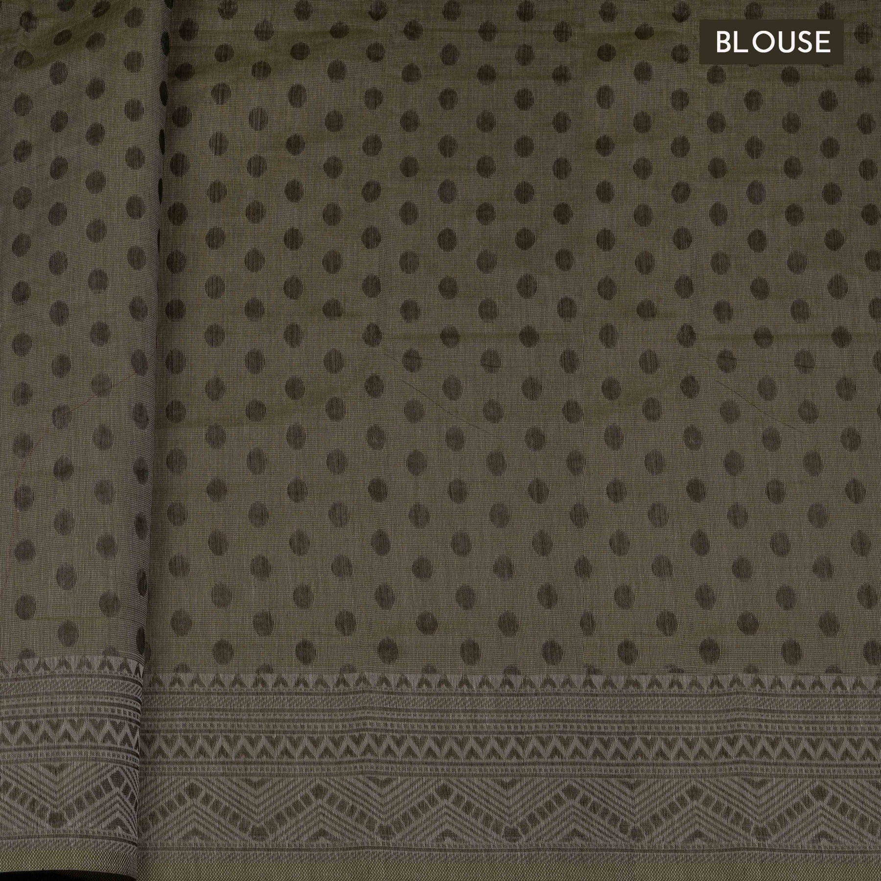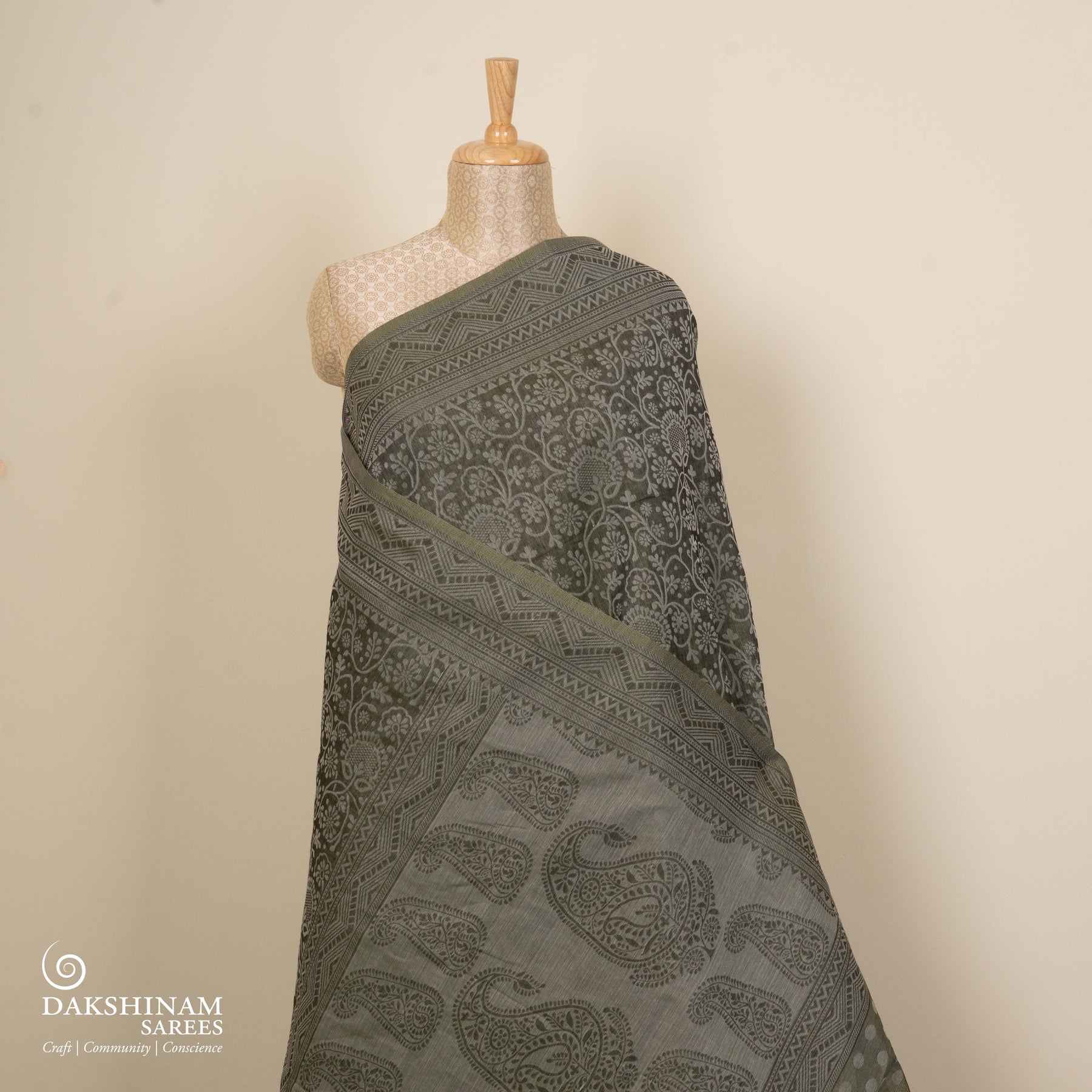 Elegant and timeless, this South cotton saree in classic black features a graceful floral vine pattern across the body. The border showcases traditional chevron lines, dotted lines, diagonal detailing, vanki motifs, and inverted triangle elements. The pallu continues the heritage design with continuous mango and paisley motifs for a cohesive traditional finish. Paired with a matching blouse featuring dot design and a continuous border, this saree is perfect for everyday elegance and cultural occasions.