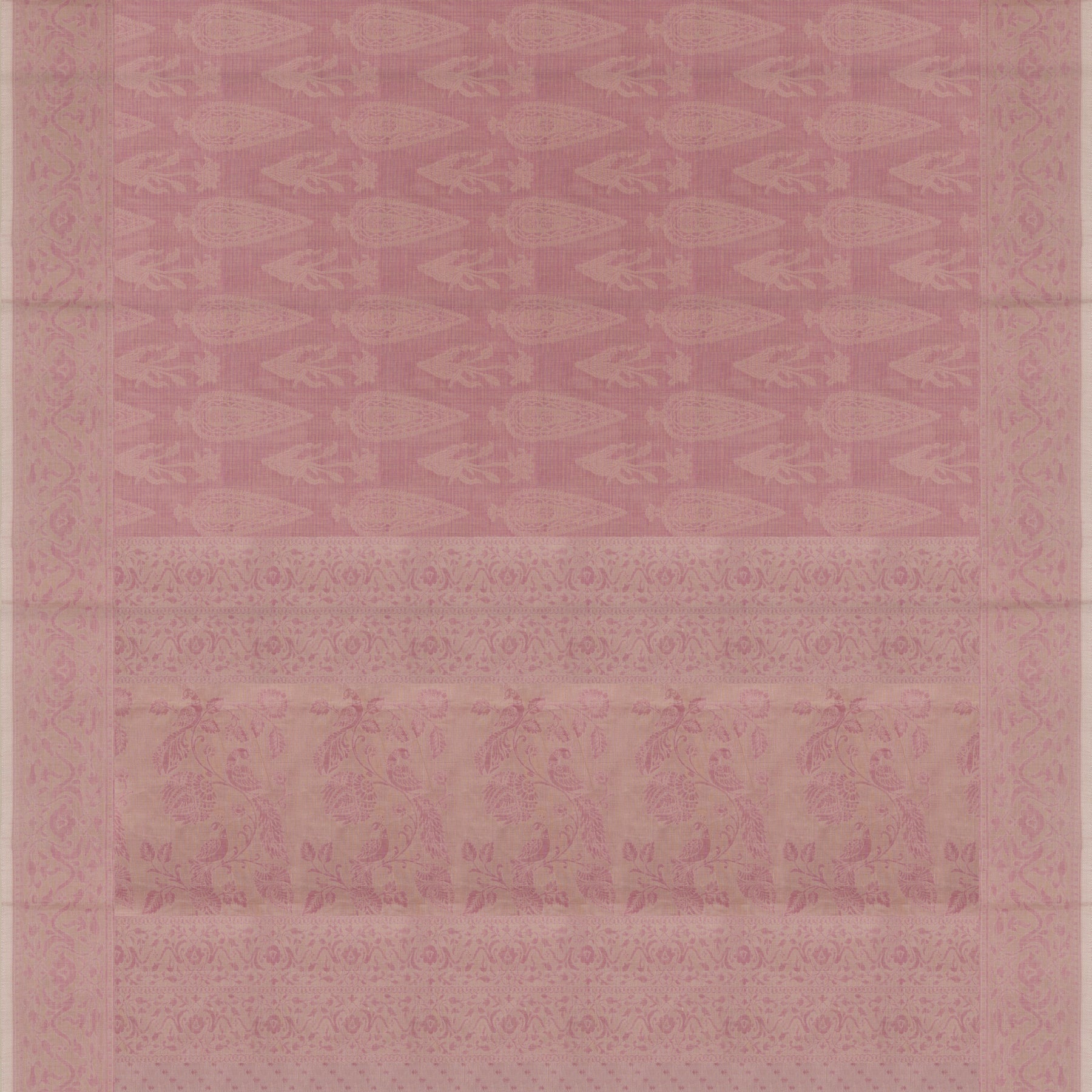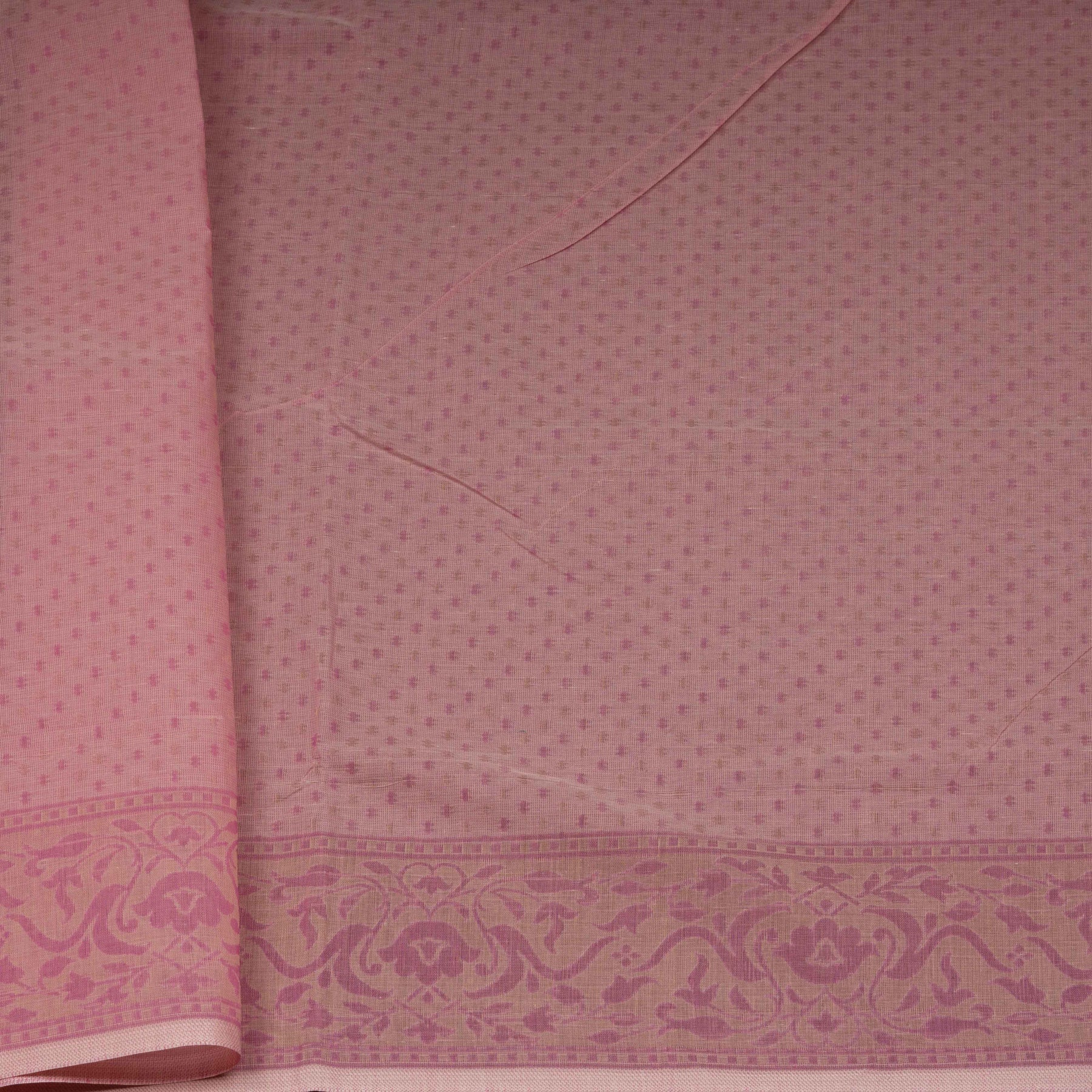 Soft and elegant, this South cotton saree in gentle pink features beautiful plant and paisley motifs woven across the body for a graceful traditional look. The border is adorned with floral weave detailing, while the pallu continues the design with similar floral elements along with a striking peacock motif set within leafy patterns. Paired with a blouse featuring diamond butta design and a continuous border, this saree is perfect for everyday elegance and cultural occasions.
