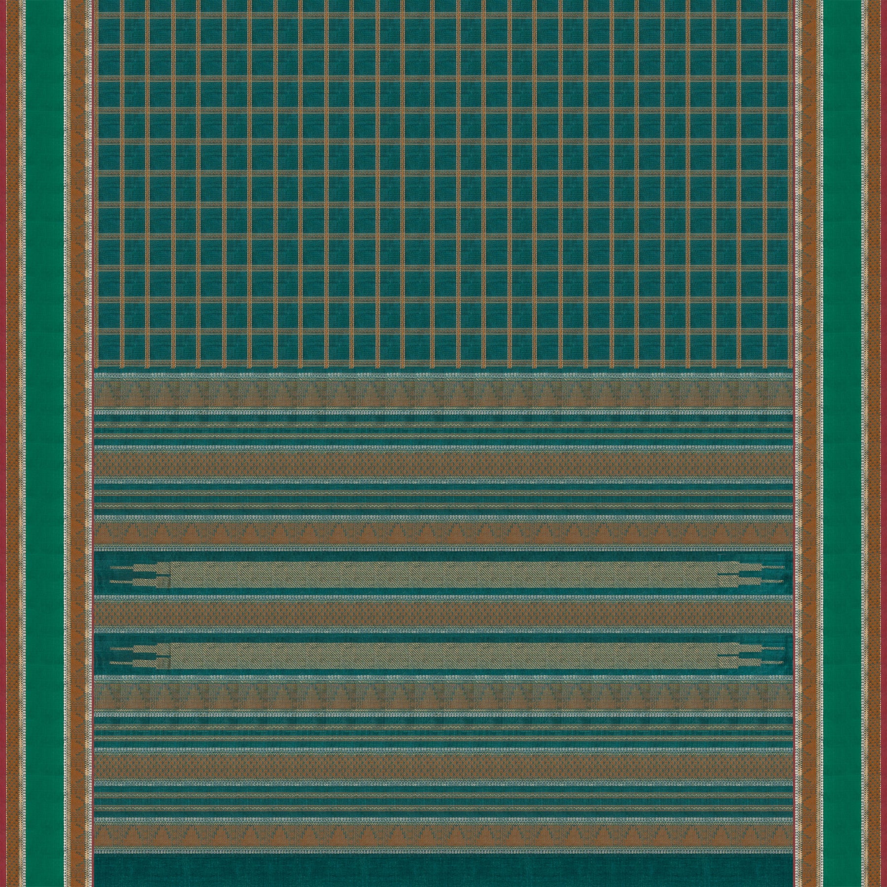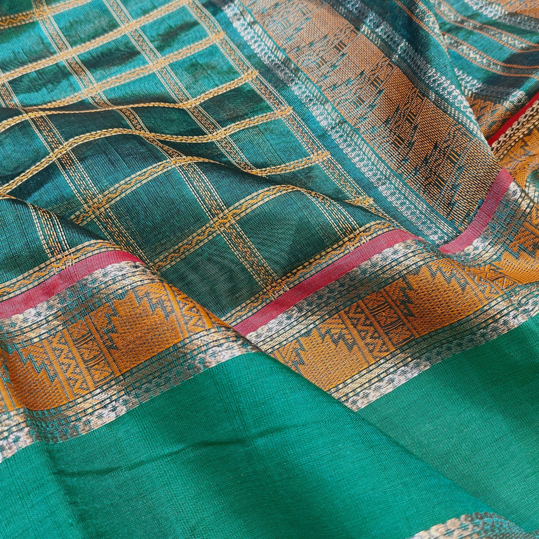 This elegant dark green silk cotton saree features a classic checked body with thread woven rettapet temple and veldhari border detailing. The pallu is beautifully designed with temple border, gold zari accents, veldhari motifs, and zigzag lines for a traditional finish.