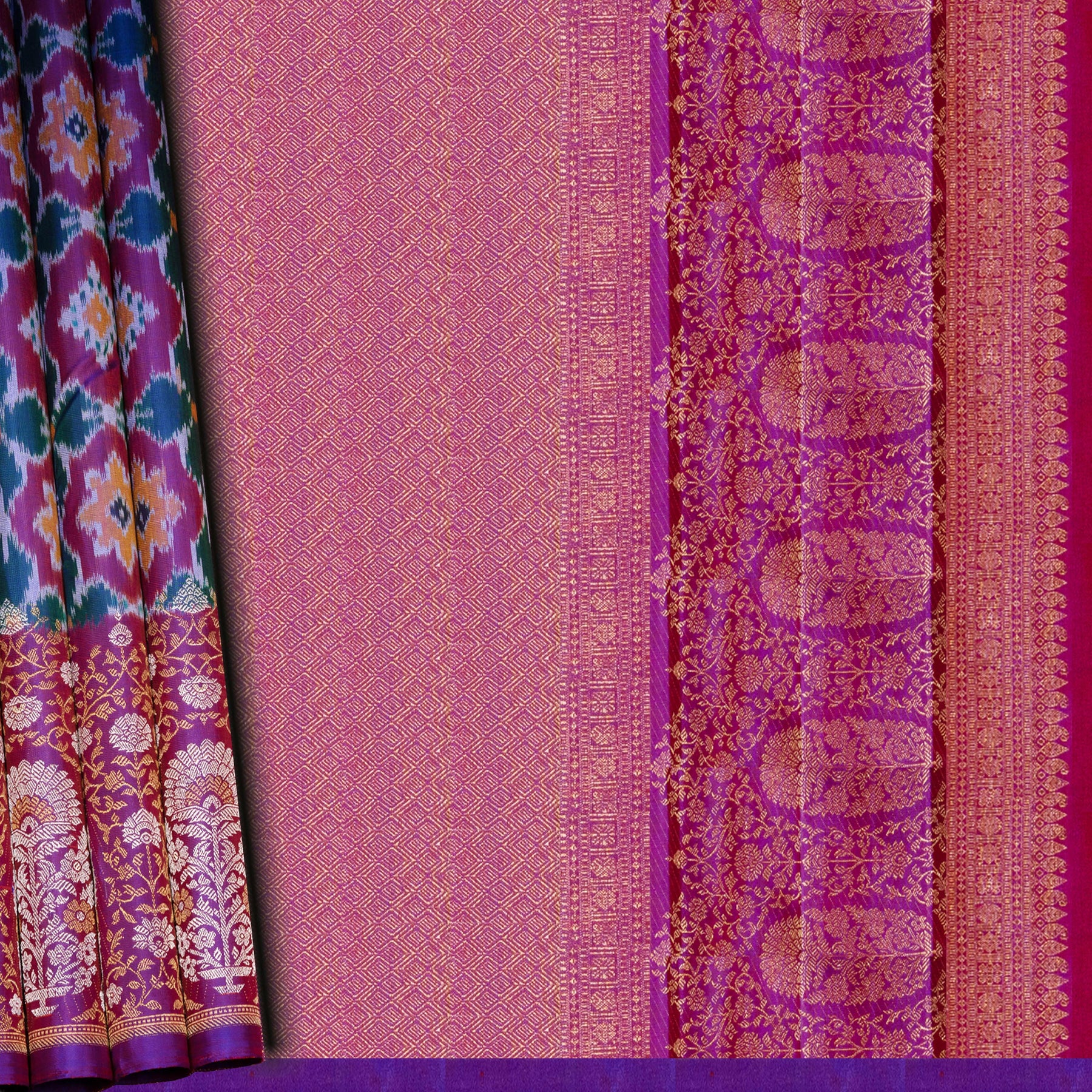 Embrace vibrant craftsmanship with this exquisite double Ikat Kanjivaram silk saree, where tradition meets striking artistry. The multicolor body is beautifully woven with geometric floral Ikat patterns, creating a rich visual rhythm that reflects timeless South Indian heritage. The regal purple border is intricately adorned with floral vines and blooming plant motifs in a harmonious blend of gold and silver zari, adding depth and grandeur. Completing the saree is a detailed purple pallu featuring diamond-shaped patterns highlighted with rudraksha, florals, leaf forms, paisleys, and echoes of the floral border design, lending it a majestic finish. Crafted from pure Kanjivaram silk, this saree is ideal for weddings, festive celebrations, and special occasions where elegance takes center stage. The purple blouse with a matching border perfectly complements the saree, completing this luxurious ensemble.