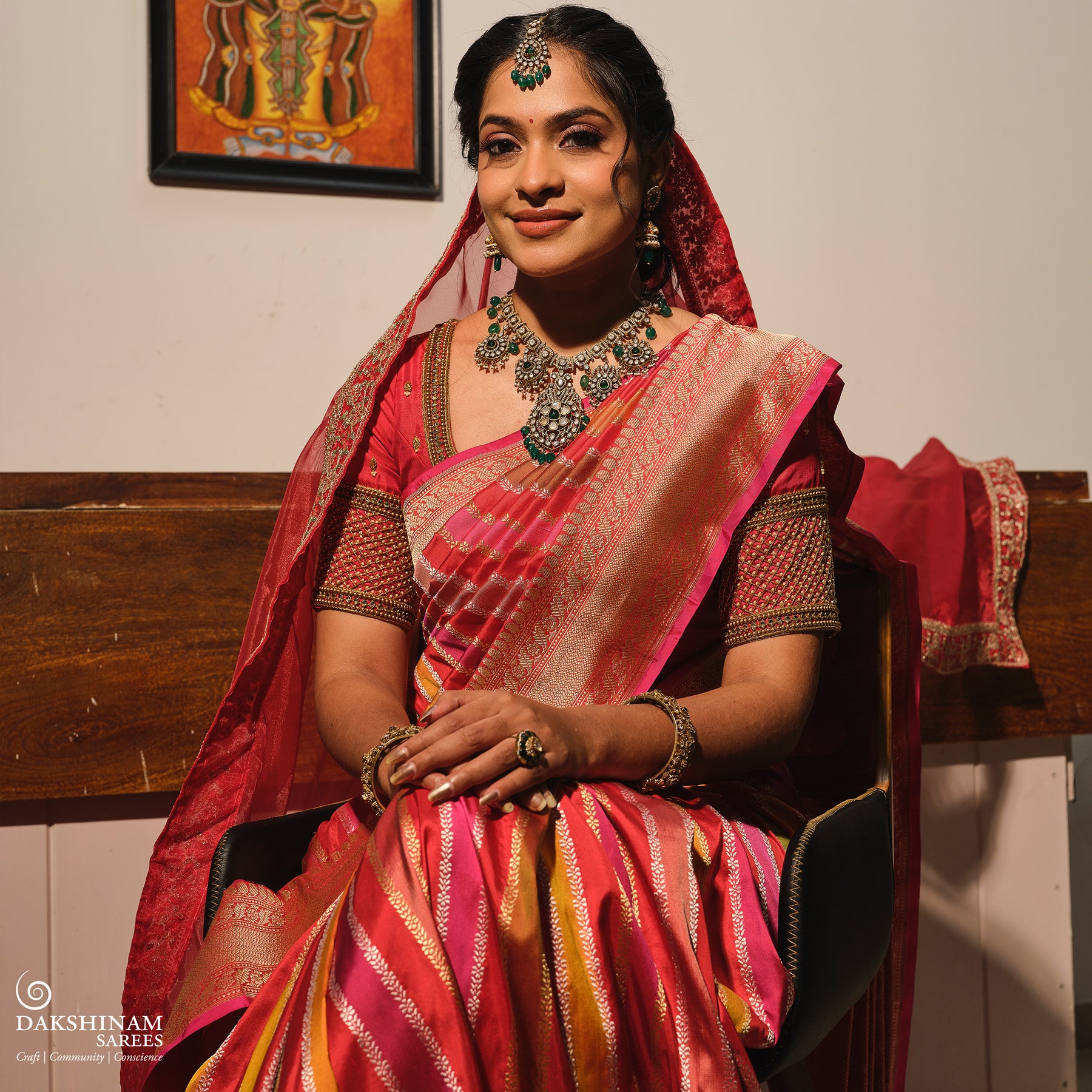 Radiant and festive, this multicolor Banarasi silk saree features striking vertical floral lines woven across a red base with alternating shades of orange, yellow, pink, and violet. The richly detailed gold zari border showcases floral, mango, and chevron motifs, while the pallu continues the traditional design with matching border elements and diamond patterns. Paired with a plain blouse featuring a continuous border, this saree is a vibrant choice for weddings, celebrations, and grand traditional occasions.