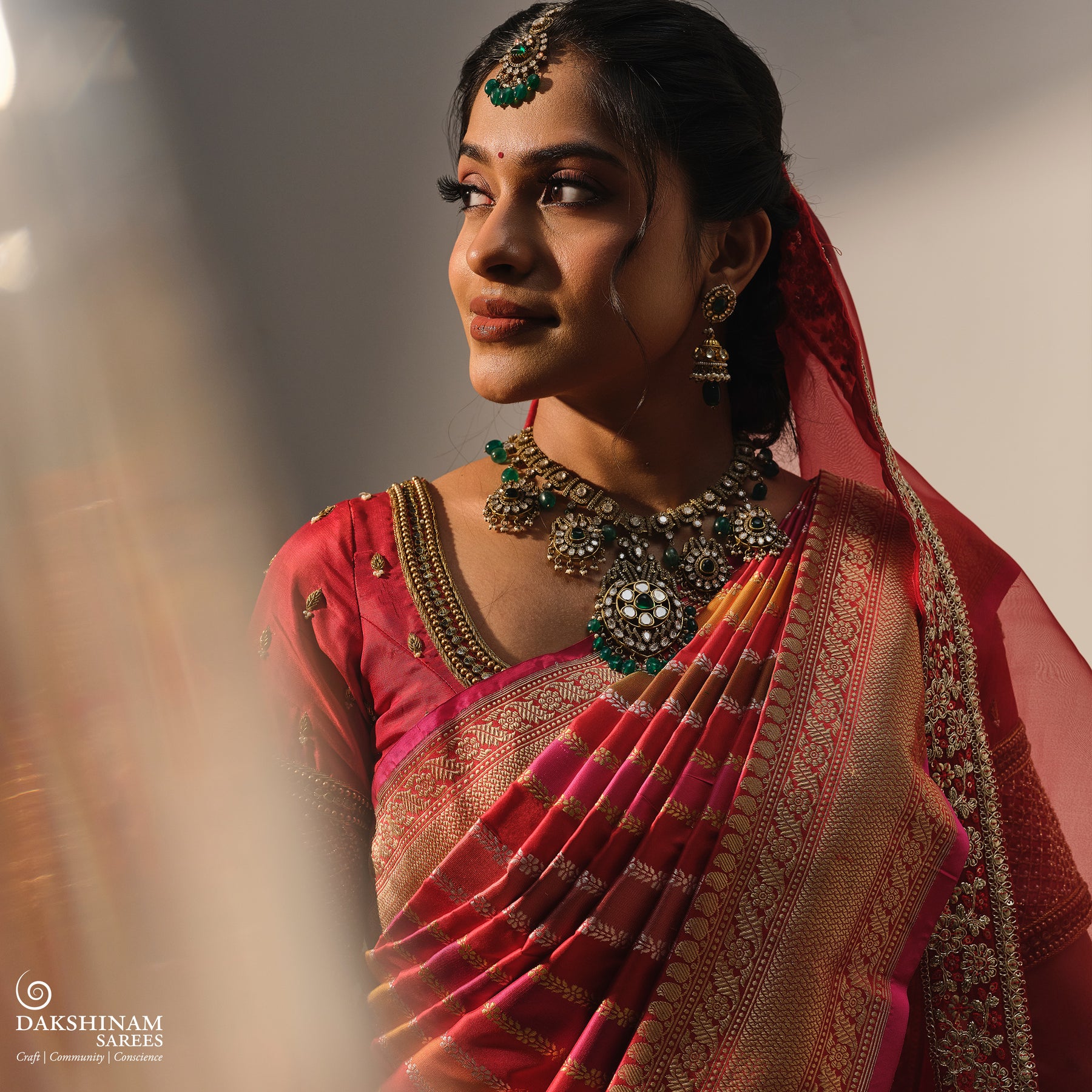 Tissue silks and heavy sarees should be dry cleaned to preserve their structure and flow. Store them flat or gently rolled, with muslin or acid-free tissue placed between folds to reduce friction and prevent color transfer. Handle them carefully while draping, using both hands, as they are more prone to tearing or distortion.
