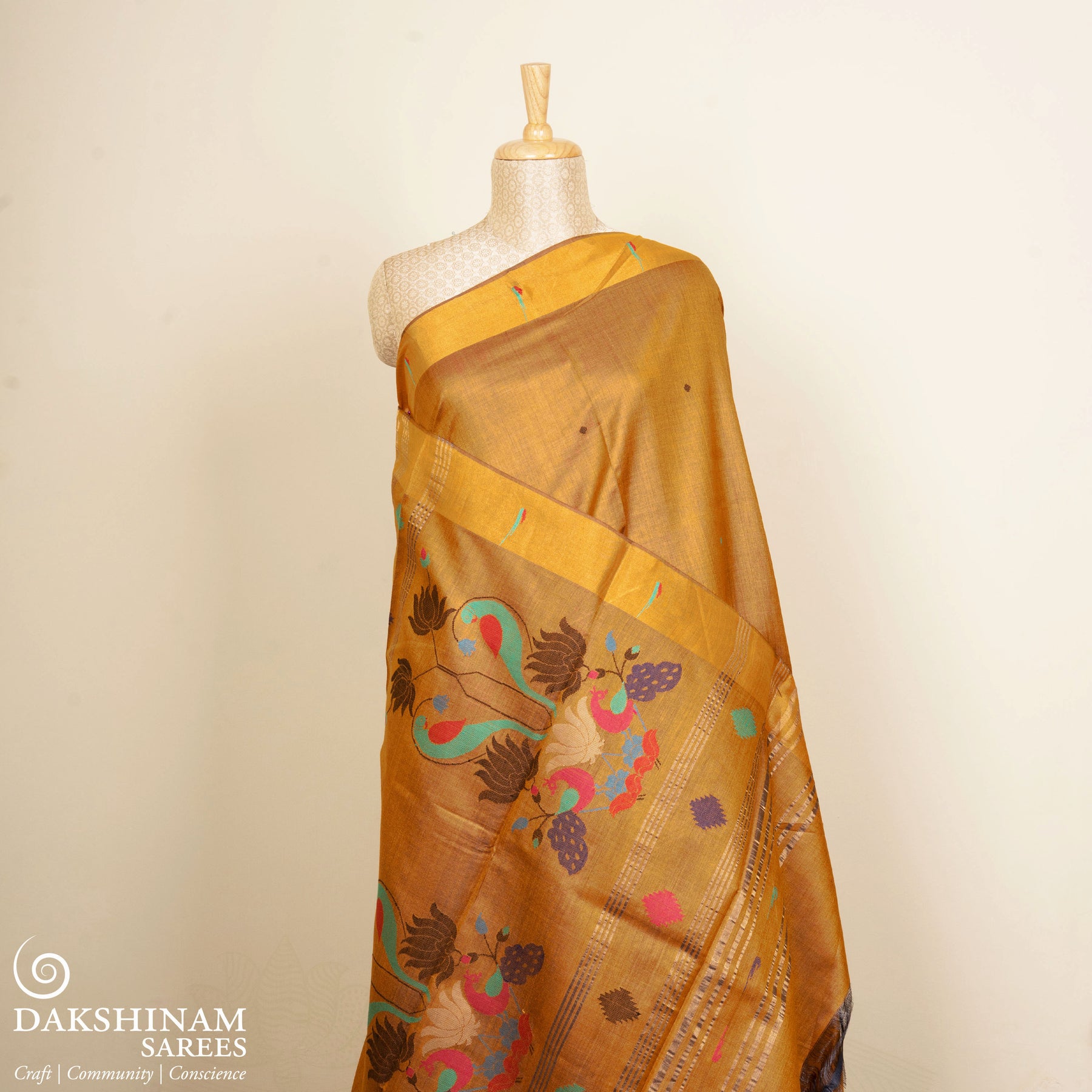 Mustard Tussar Silk Paithani Saree with Gold Zari and Bird Jamdani Pallu