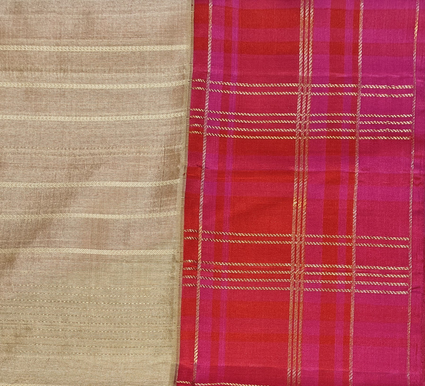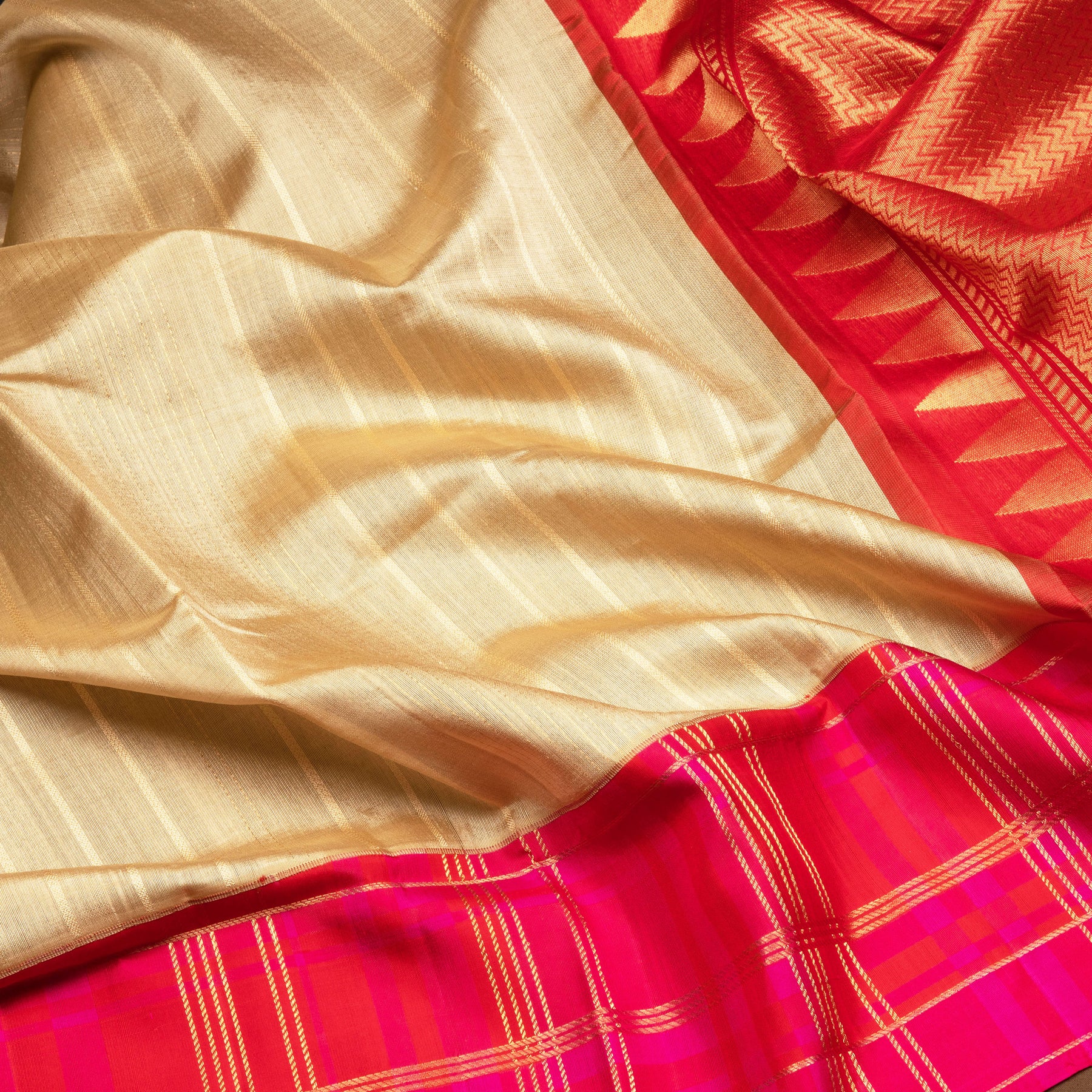 This elegant sandal Kora Gadwal silk saree features a soft silk-finish body with subtle self stripes for a refined traditional look. The pink and red checked border with gold zari detailing adds rich contrast, while the red pallu is beautifully designed with triangle, zigzag, dotted, and straight line motifs in gold zari.