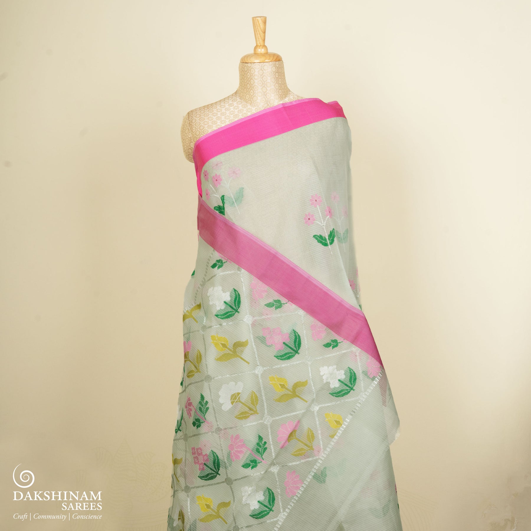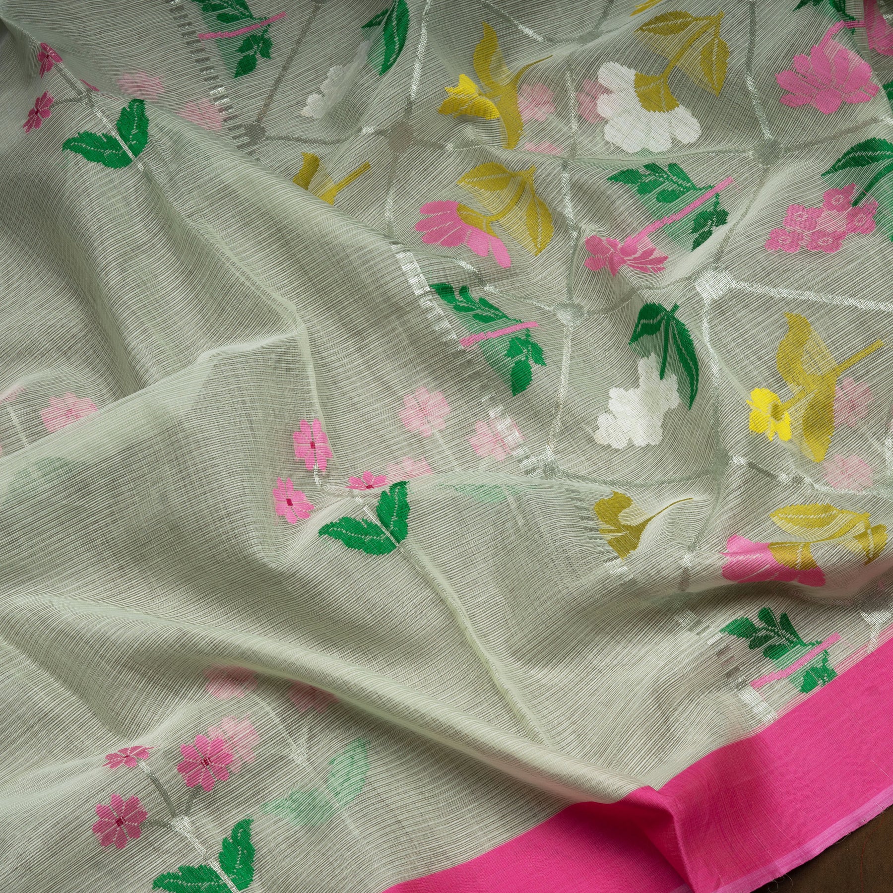 Light Green Kota Doria Silk Saree with Silver Zari Floral Motifs and Pink Border