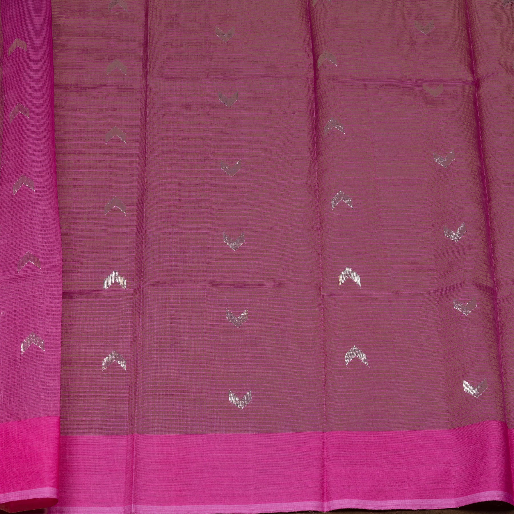 This graceful light green Kota doria silk saree features delicate floral motifs woven in silver zari and silk thread across the body. The pallu is enhanced with floral patterns and subtle diamond zari detailing, adding elegance to the drape. A soft pink silk border brings a beautiful contrast, while the saree remains lightweight and breathable—perfect for summer wear, everyday elegance, and ethnic occasions. It comes with a pink blouse designed with silver zari arrow patterns.
