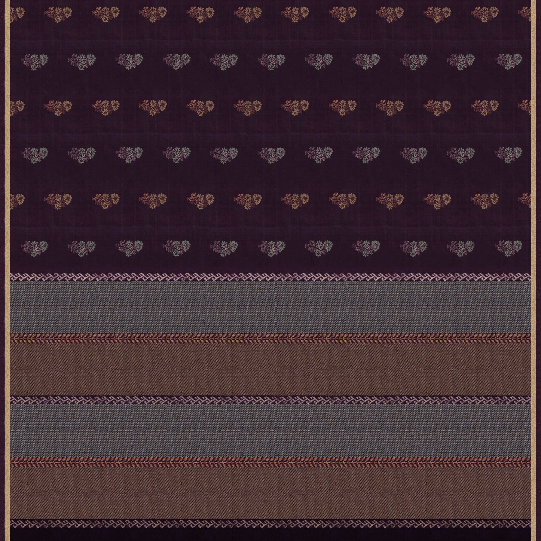 This elegant soft silk saree features a rich violet body adorned with delicate floral motifs woven in shimmering gold and silver zari, adding a refined traditional charm. The beautifully contrasting pallu comes in a vibrant green shade highlighted with an orange panel and detailed floral and leaf line patterns that enhance the saree’s artistic appeal. Paired with a plain violet blouse finished with a subtle zari line, this saree creates a graceful and balanced look, making it perfect for festive occasions, celebrations, and elegant traditional wear.