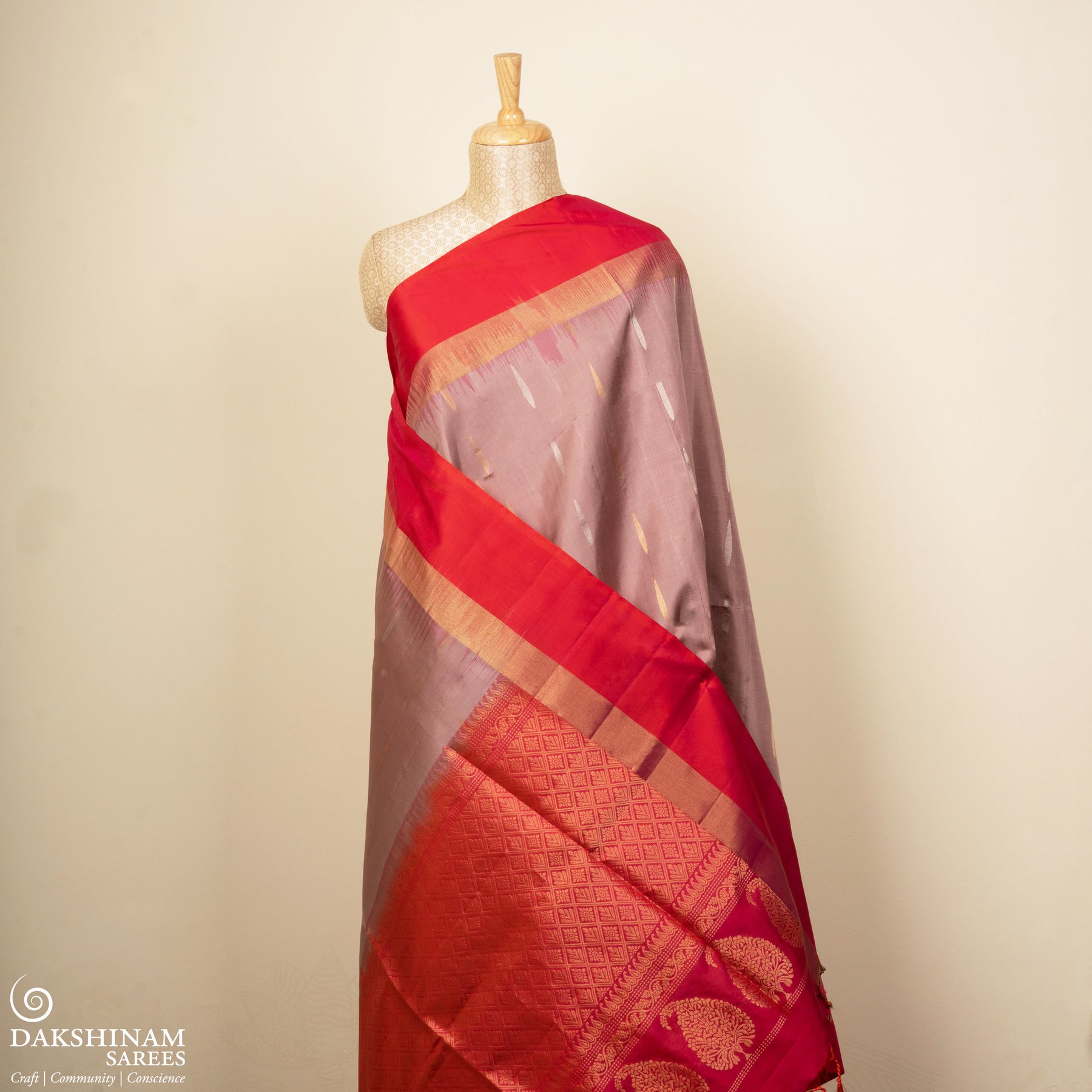 Always dry clean woven silks, especially if they feature zari or intricate weaves. Store them wrapped in muslin or cotton cloth in a cool, dark space, avoiding plastic covers. Refold every few months to prevent permanent creases, and iron gently on low heat with a protective cotton cloth placed on top.