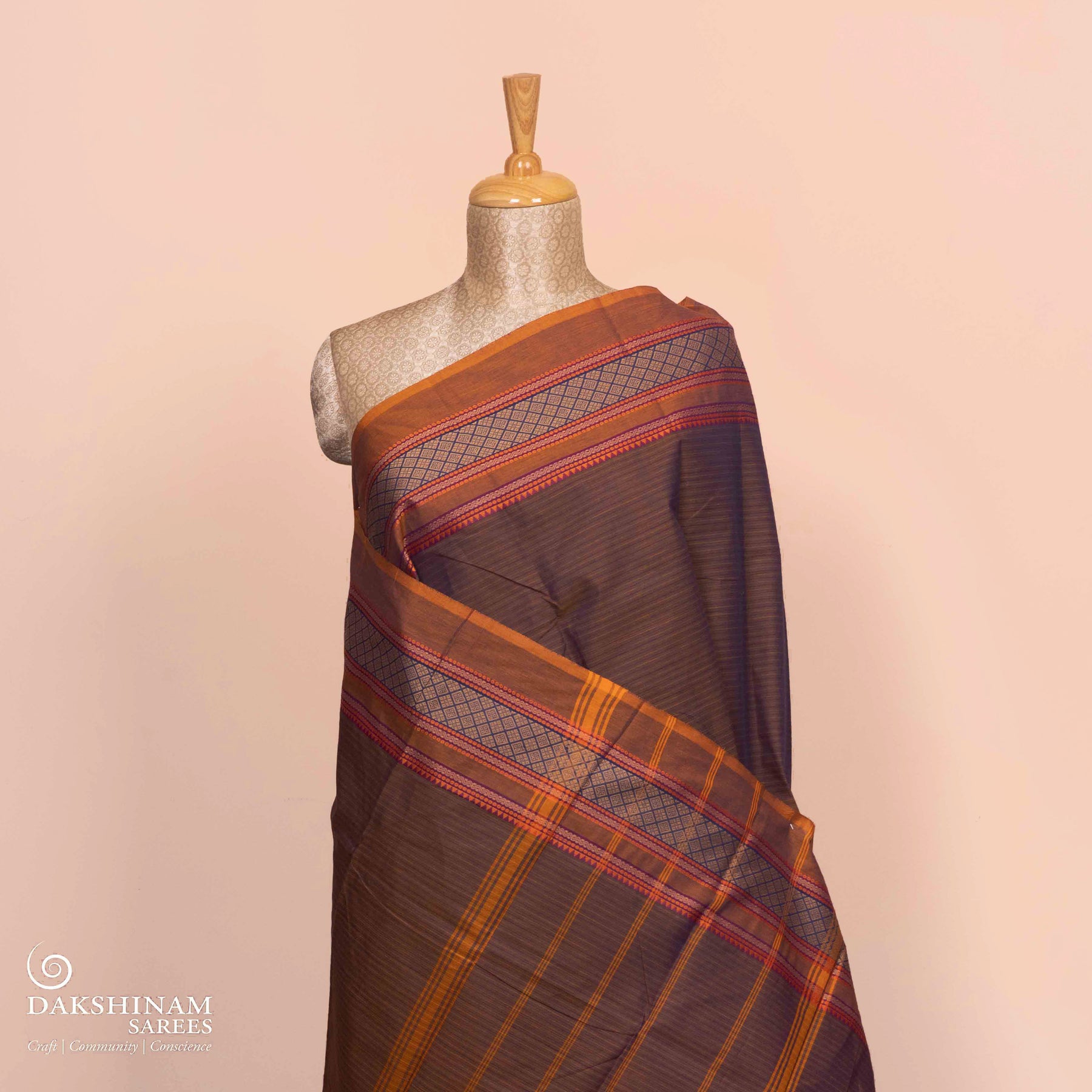 Handwoven Brown with Orange border Chettinad Cotton Saree- 3064T014251DSC