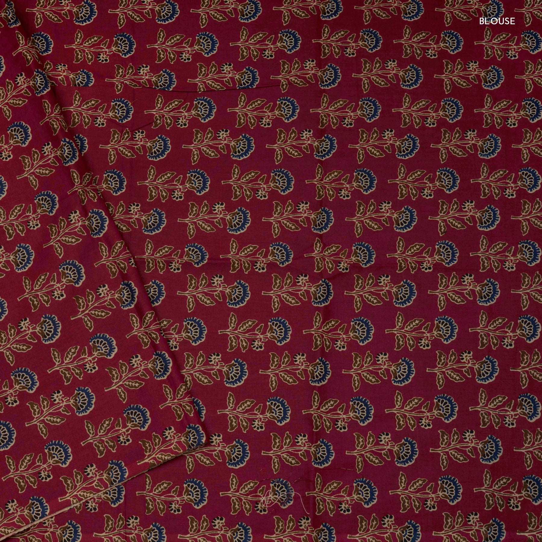 This Chettinad cotton saree is a beautiful representation of South Indian weaving artistry. The dual-toned grey and purple body, highlighted with magenta and yellow stripes, adds depth and vibrancy. The contrasting orange mustard border is adorned with diamond shapes, dots, and zigzag patterns in hints of magenta and blue, offering a playful yet elegant touch. The pallu features orange stripes, tying the look together gracefully. Paired with a contrasting block printed floral blouse, this saree is perfect for festive occasions or everyday wear.
