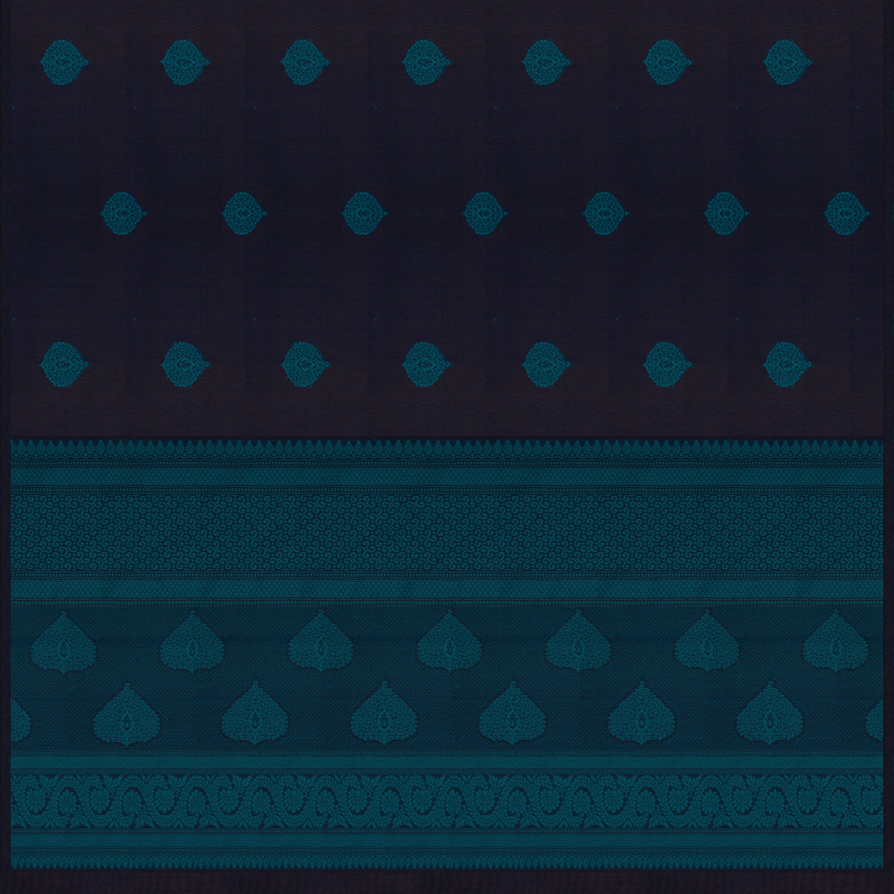 Calm and graceful, this handwoven South Cotton saree features a serene blue body with a matching monotone border and pallu. Decorated with delicate florals, leaf-shaped buttas, diamonds, stripes, and floral vines, it offers a simple yet charming design. Paired with a plain blouse, this no-zari saree is perfect for understated elegance.