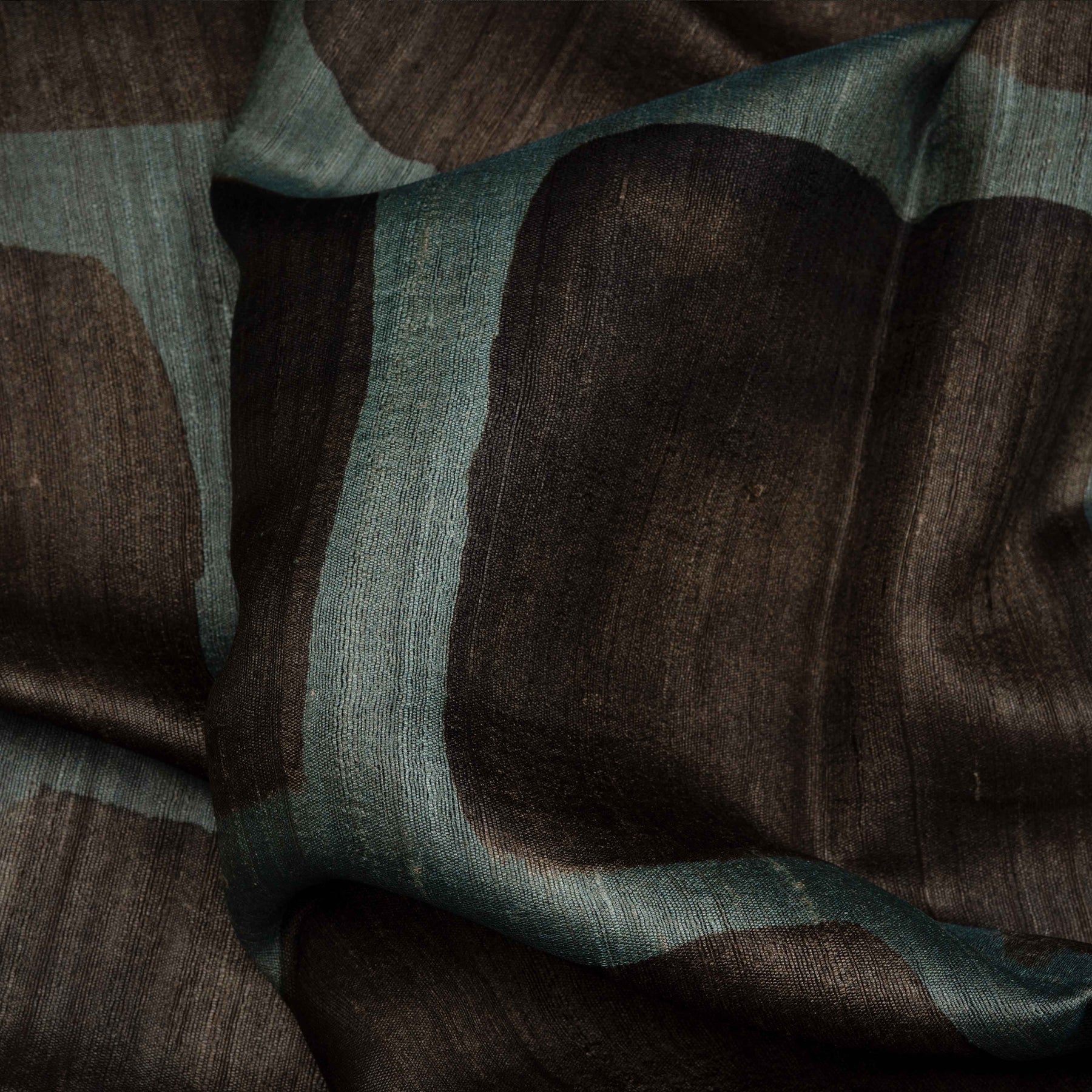 Sophisticated and contemporary, this breathable pure Tussar silk handloom saree features a soothing greyish teal blue base with a distinctive rectangular curved edge print in deep grey, creating a subtle yet striking pattern across the body. The monotone border is elegantly simple, accented with delicate copper zari stripes that add warmth and shimmer without overpowering the design. The pallu continues the theme with refined copper zari stripes, harmonizing perfectly with the saree’s understated elegance. The accompanying blouse is designed with a diamond-shaped pattern highlighted by copper stripes, completing the ensemble with modern finesse. This saree from our festive-ready zari-bordered printed Tussar silk sarees collection is ideal for office wear, festive occasions, or stylish day events, offering both comfort and timeless style.