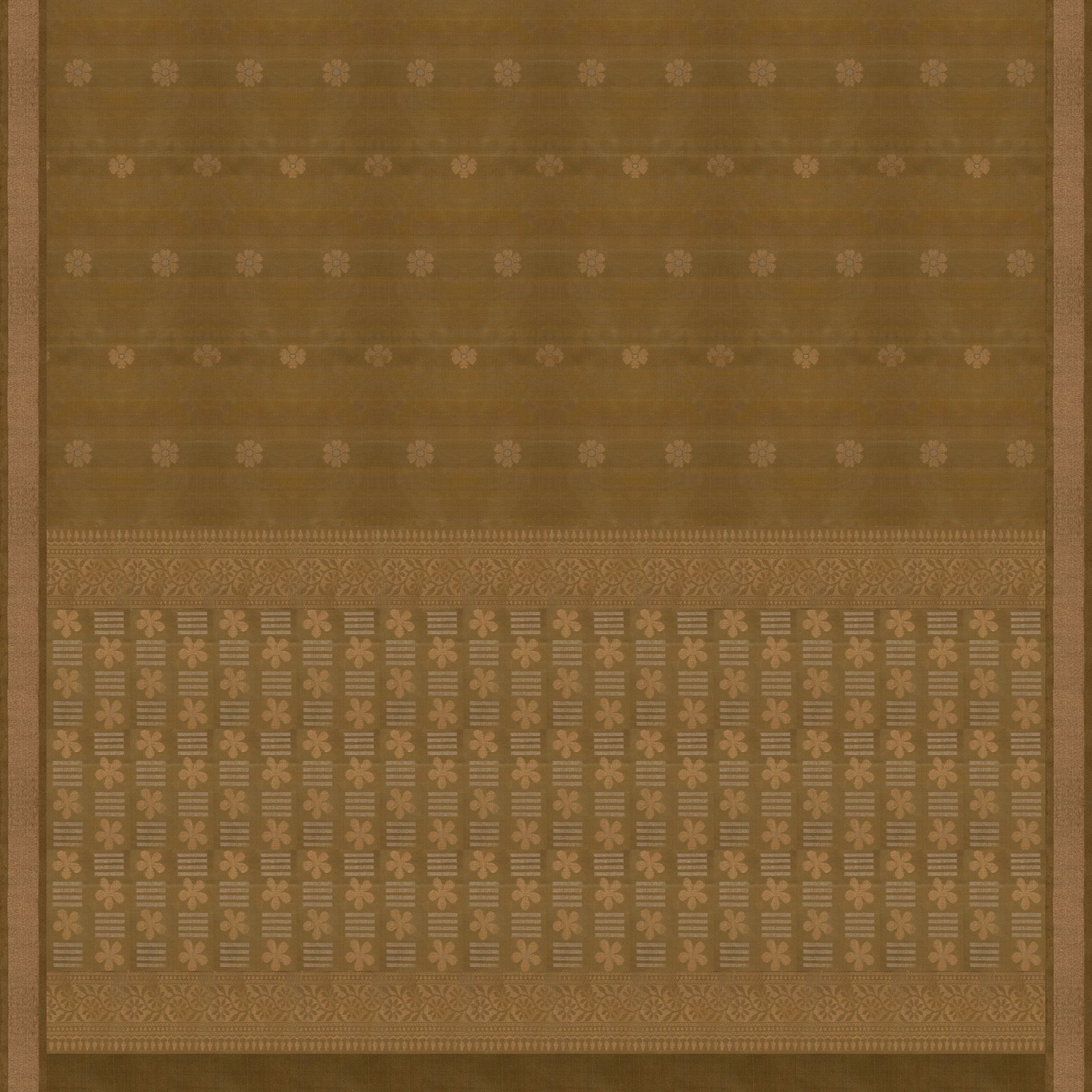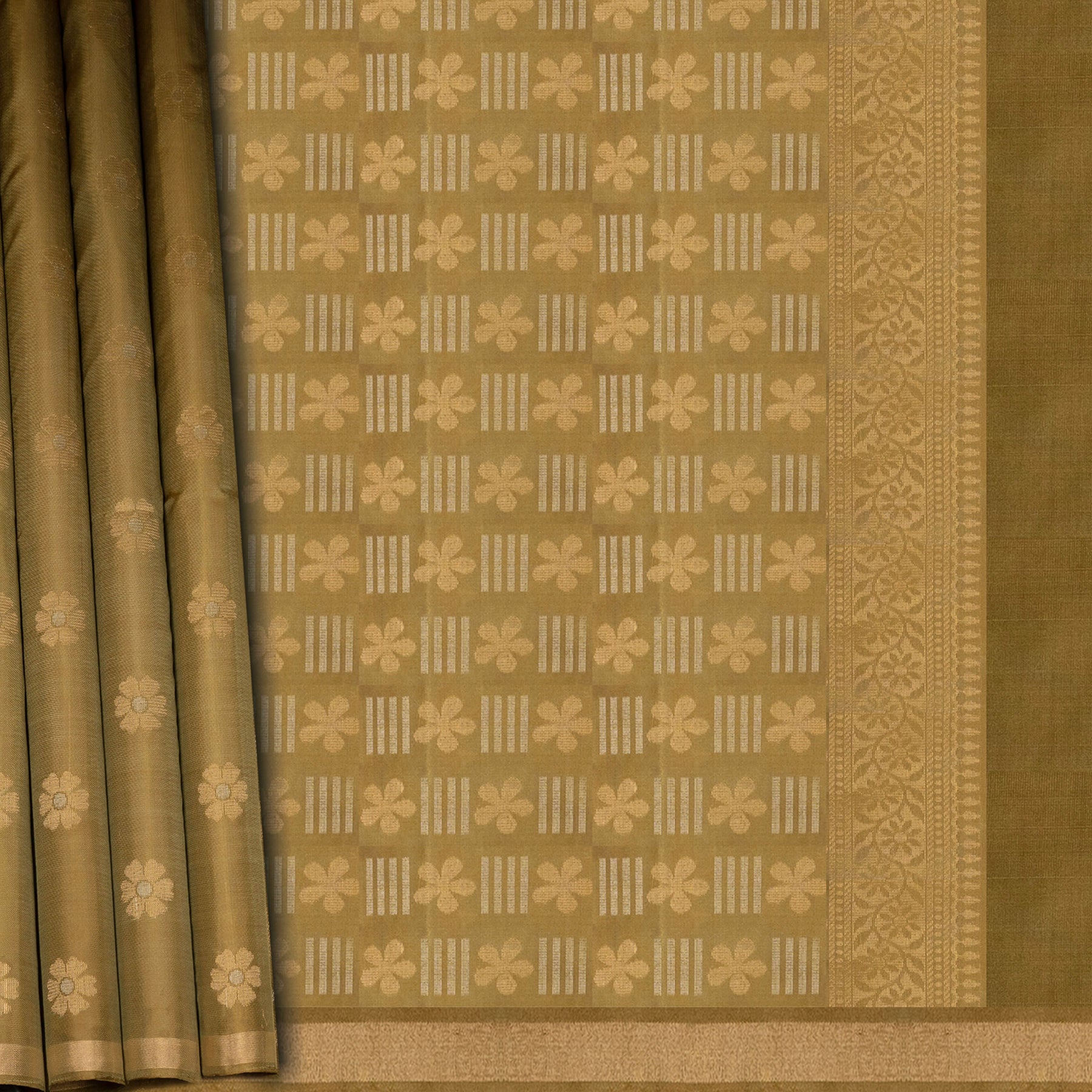 Step into understated elegance with this lightweight soft silk saree in a serene moss green shade. The body is adorned with delicate floral buttas woven with gold and silver zari, lending a subtle shimmer to the fabric. A refined tissue border enhances the saree’s graceful appeal, while the monotone pallu features flowing floral vines, dash-shaped buttas, and neat lines of leaf motifs that complete the look with quiet sophistication. Designed for comfort and versatility, this soft silk saree is ideal for everyday elegance, workwear, and intimate festive occasions.