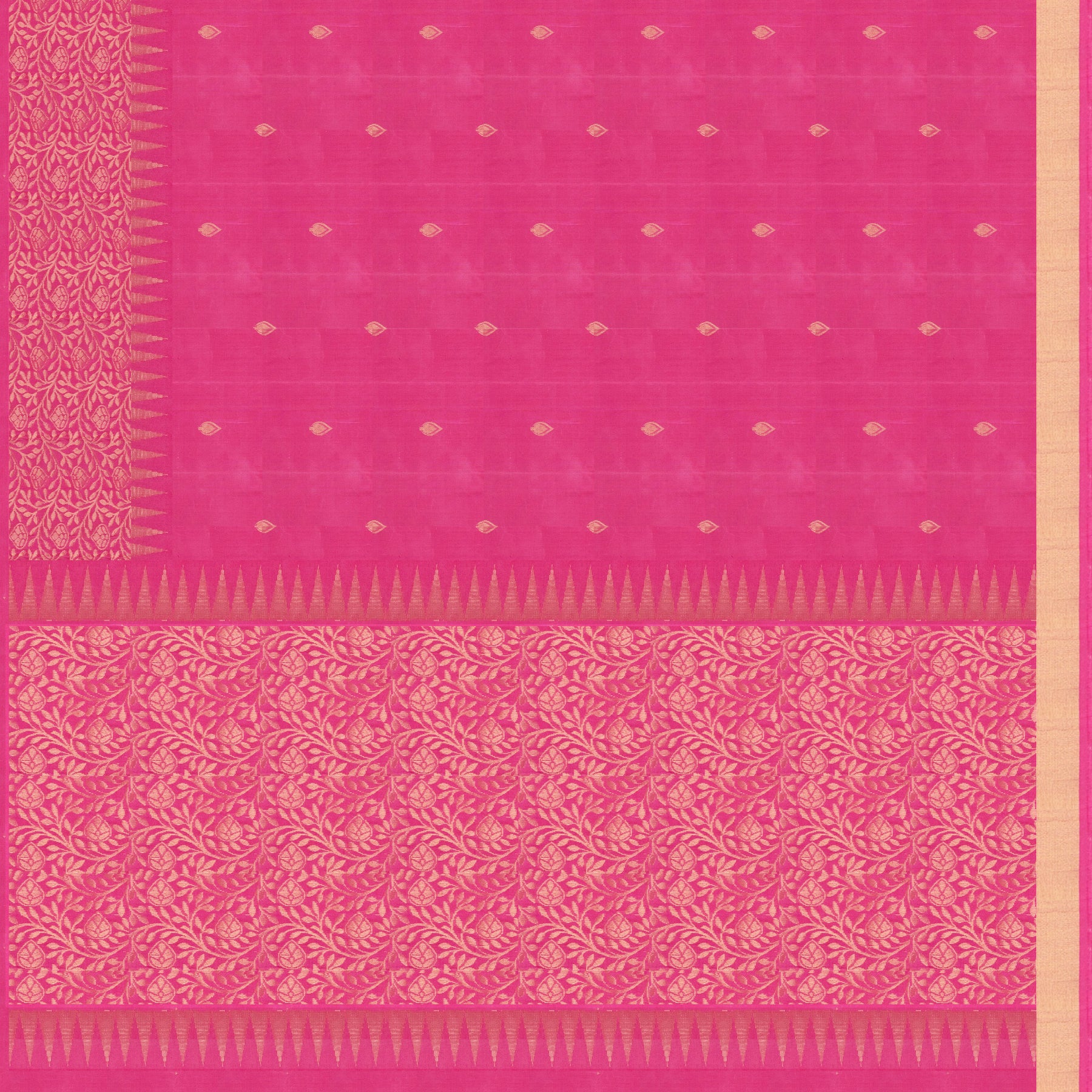 Add timeless elegance to your wardrobe with this graceful soft silk saree in a vibrant Rani pink hue. The body is adorned with delicate leaf buttas, lending a subtle charm, while the monotone border features classic temple motifs enhanced with florals and flowing leaf vines woven in rich gold zari. The pallu mirrors the border design, creating a beautifully balanced and traditional finish. Lightweight and fluid, this soft silk saree is ideal for daily wear, festive gatherings, and elegant occasions.